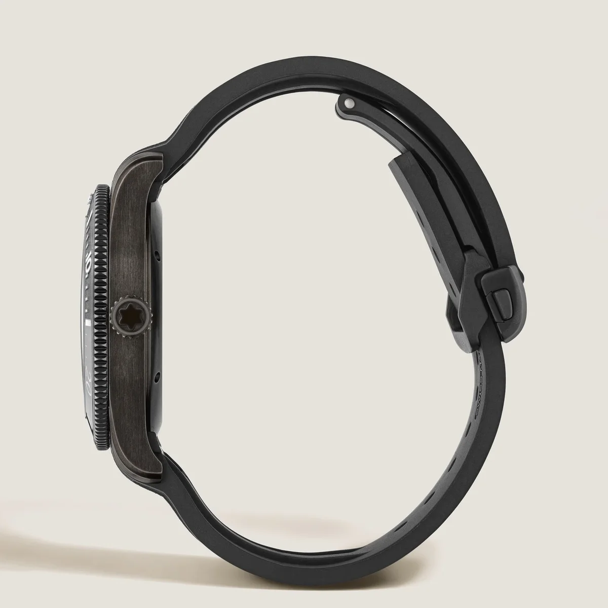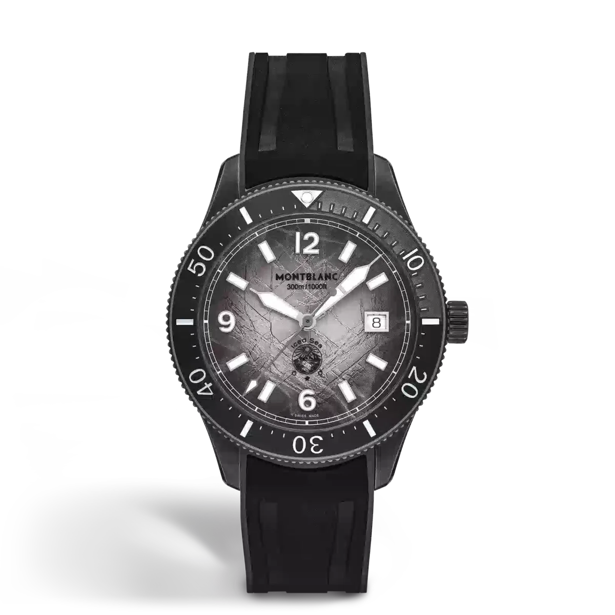 Die Montblanc Iced Sea Automatic Date 0 Oxygen mit grauem Zifferblatt im Sfumato-Gletschermuster vermittelt den Eindruck, als würde man in die Tiefen eines Gletschers blicken. Inspiriert von der Mer de Glace wurde diese Gletscherstruktur mit einer fast vergessenen traditionellen Technik namens „gratté-boisé” erzielt. Die Uhr ist in einem 41 mm großen Gehäuse aus Distressed-Stahl untergebracht, das vollständig sauerstofffrei ist, und verfügt über eine einseitig drehbare Lünette mit schwarzem Keramikeinsatz, der per Laser von 0 bis 15 Minuten vertieft wurde, eine 3D-Gravur auf dem Gehäuseboden und ein austauschbares schwarzes Kautschukarmband mit Feineinstellungssystem. Die Uhr entspricht der Norm ISO 6425 für Taucheruhren und ist bis 300 Meter wasserdicht. Ident-Nr. MB134017 Bandanstoßbreite 20 mm