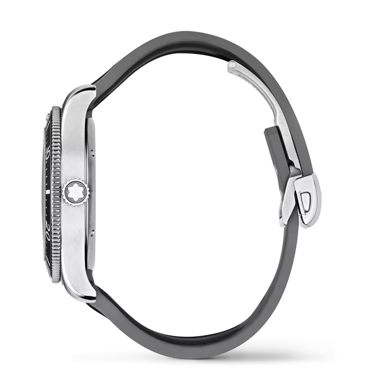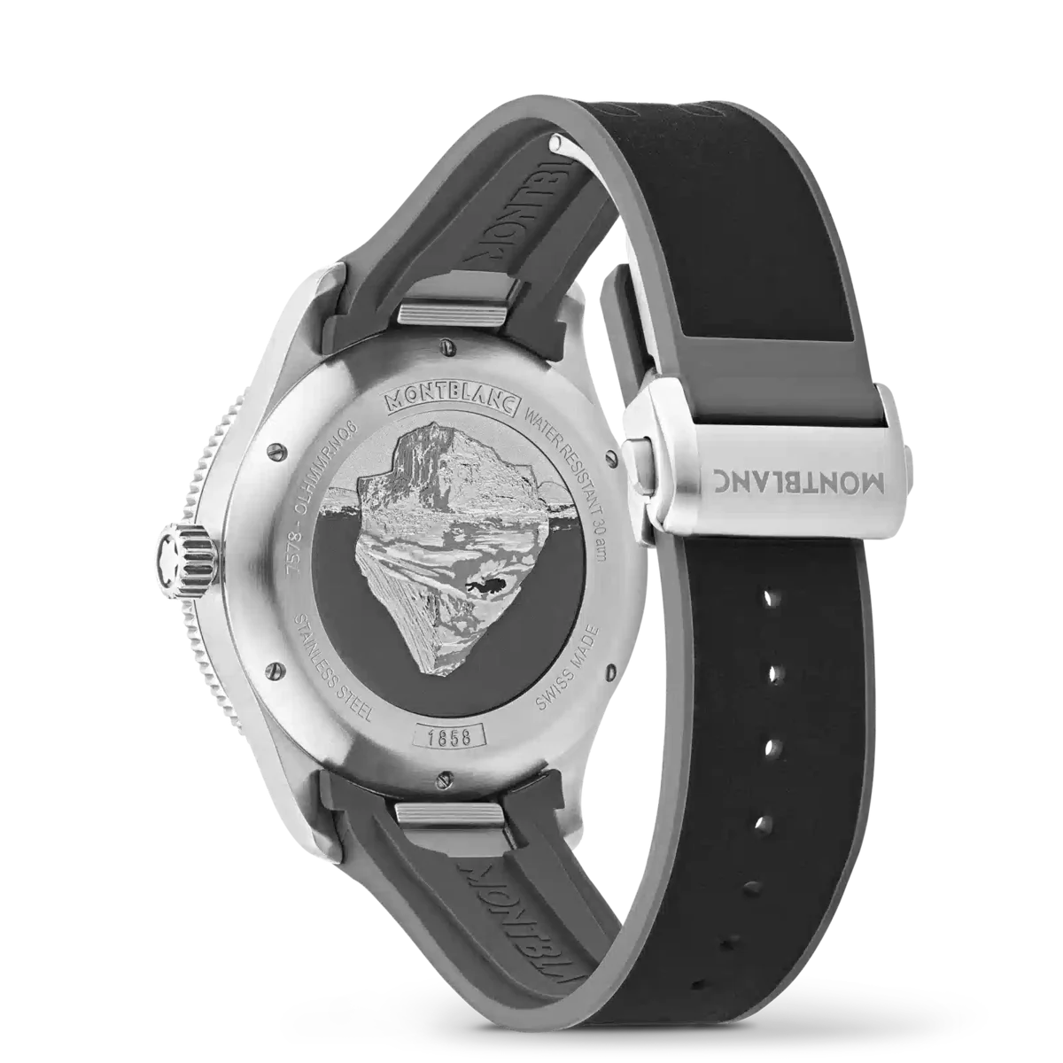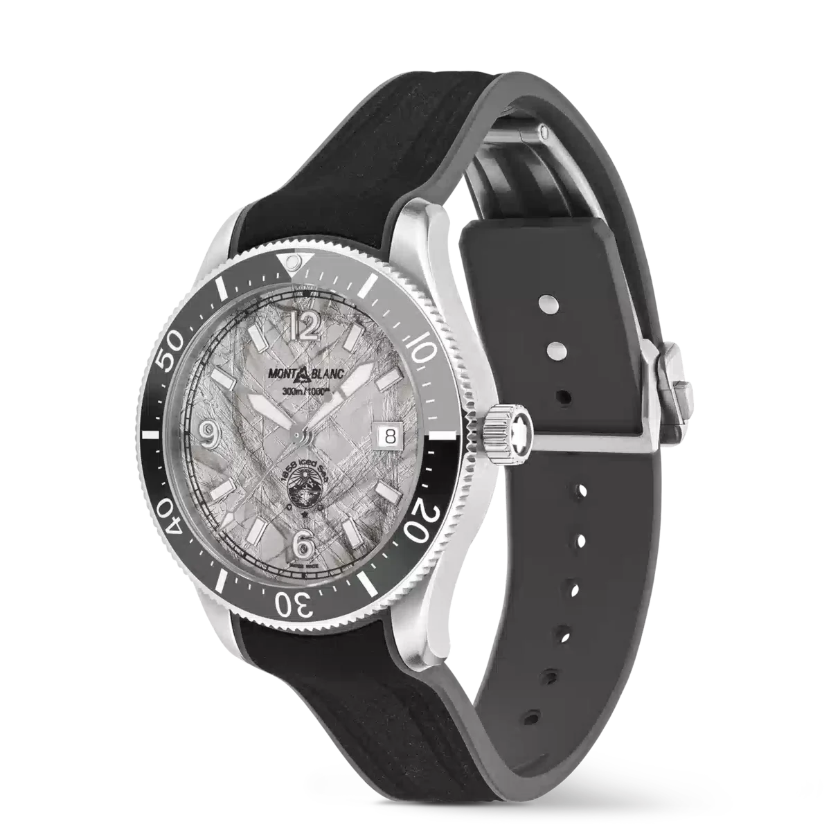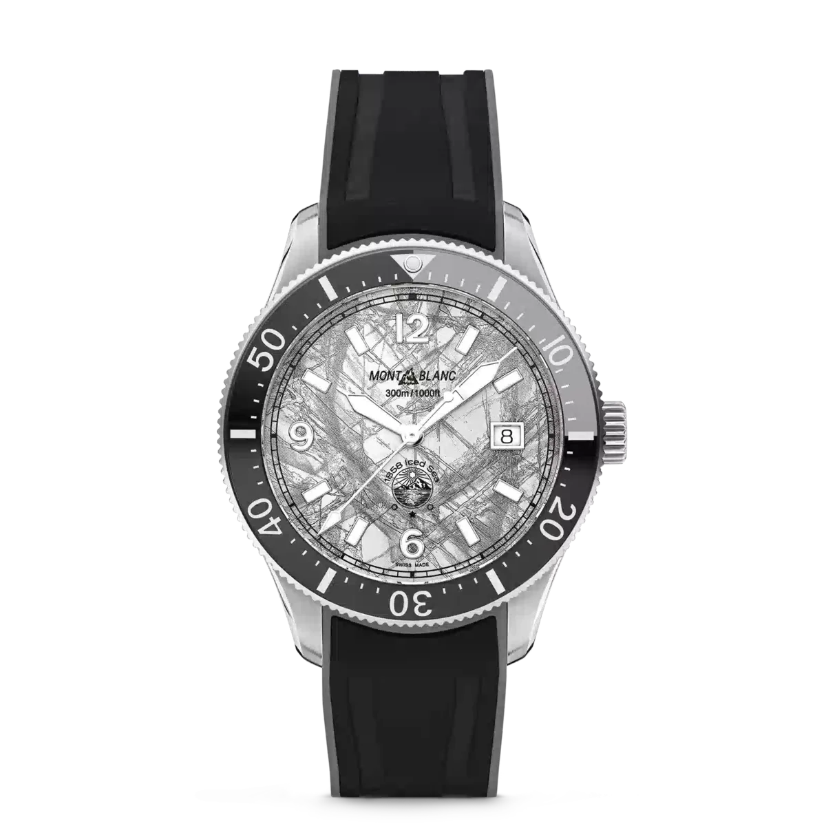 Die Montblanc Iced Sea Automatic Date mit grauem Zifferblatt im Gletschermuster vermittelt den Eindruck, in die Tiefen eines Gletschers zu blicken, in dem alle Mineralien seit Jahrtausenden eingeschlossen sind. Inspiriert von der Mer de Glace wurde diese Gletscherstruktur mit einer fast vergessenen traditionellen Technik namens „gratté-boisé” erzielt. Die 41-mm-Uhr wird mit einem schwarzen, austauschbaren Kautschukarmband mit grauer Umrandung geliefert, das schnell und einfach gegen ein Edelstahlarmband ausgetauscht werden kann, ohne dass Sie dafür in die Boutique zurückkehren oder Werkzeuge verwenden müssen. Es lässt sich auch am Handgelenk anpassen, wenn Sie die Uhr zum Tauchen tragen. Die Uhr entspricht der Norm ISO 6425 für Sporttauchen, ist bis 300 Meter wasserdicht und verfügt über lumineszierende Markierungen für gute Ablesbarkeit bei schlechten Lichtverhältnissen. Ident-Nr. MB130807 Bandanstoßbreite 20 mm