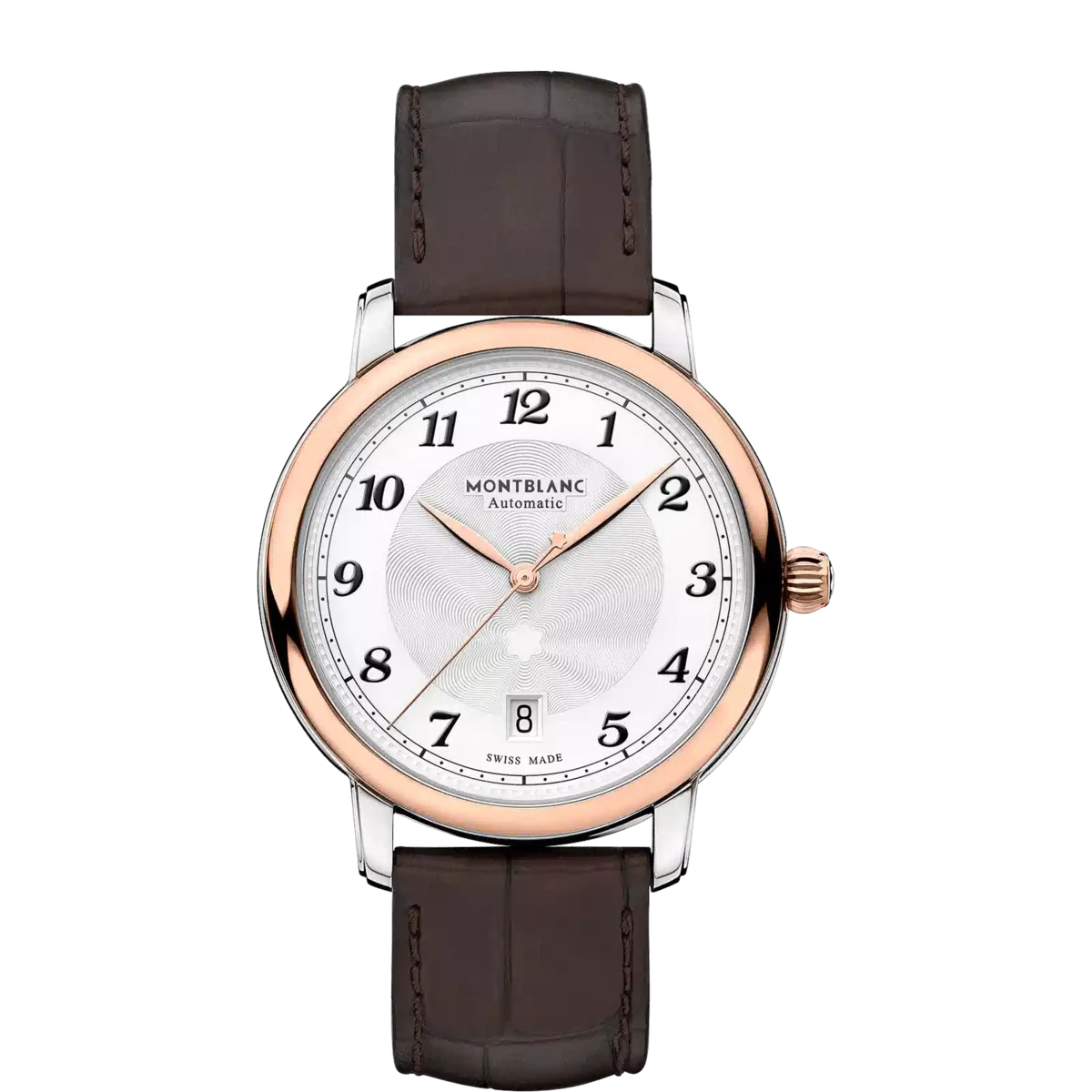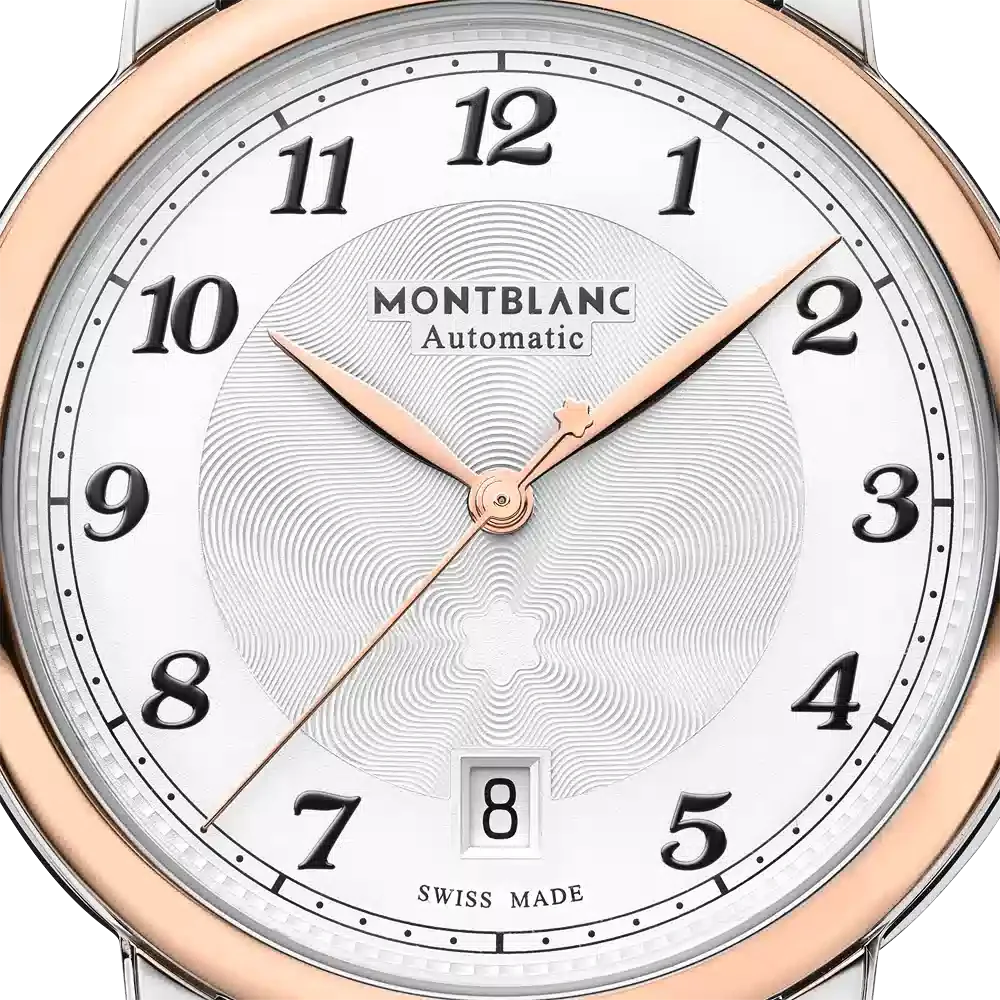 Die Produktlinie Montblanc Star Legacy ist inspiriert vom Erbe von Minerva und den Taschenuhren des Unternehmens, die im späten 19. und frühen 20. Jahrhundert hergestellt wurden. Die Star Legacy Automatic Date weist alle Designmerkmale der Produktlinie auf, darunter ein raffiniertes Zifferblatt mit dem Guilloché-Muster „Exploding Star“ von Montblanc, roségoldbeschichtete blattförmige Stunden- und Minutenzeiger, neu gestaltete arabische Ziffern, die an die historischen Taschenuhren von Minerva erinnern, ein Filet Sauté (auf- und absteigende Guilloché-Linien), eine Eisenbahnminutenskala und ein Sekundenzeiger mit dem Montblanc-Emblem an der Spitze. Die Uhr hat ein 39-mm-Gehäuse aus Edelstahl und 750/1000 (18 Karat) Roségold, ein silberweißes Zifferblatt und ein braunes Alligatorlederarmband. Ident-Nr. MB117577 Bandanstoßbreite 19 mm