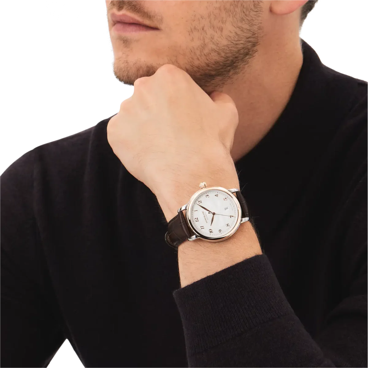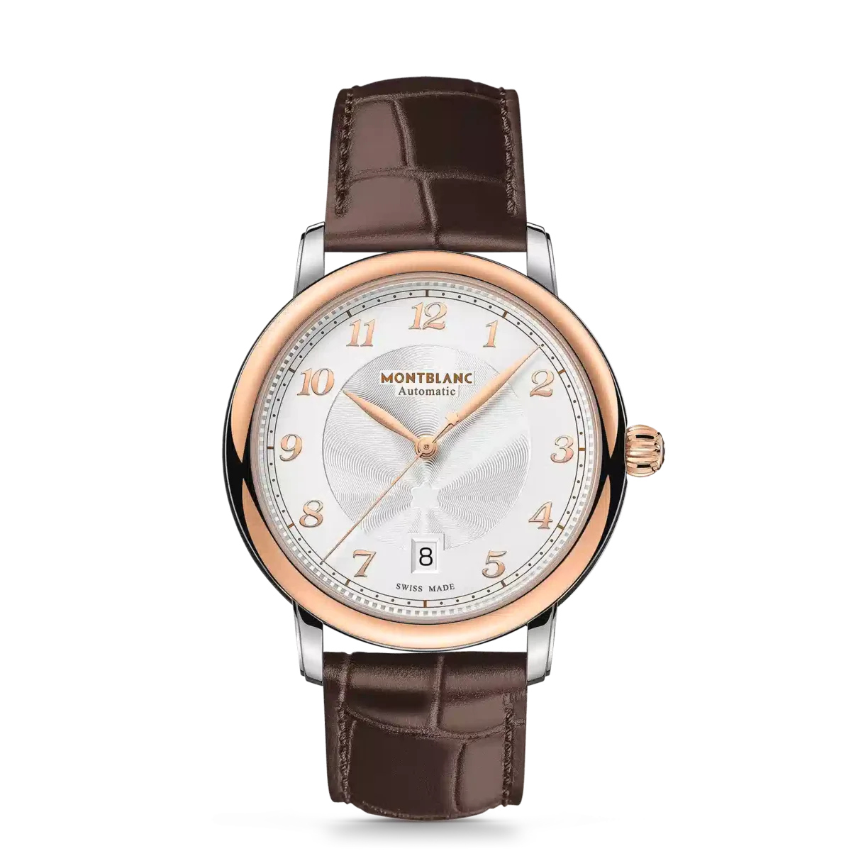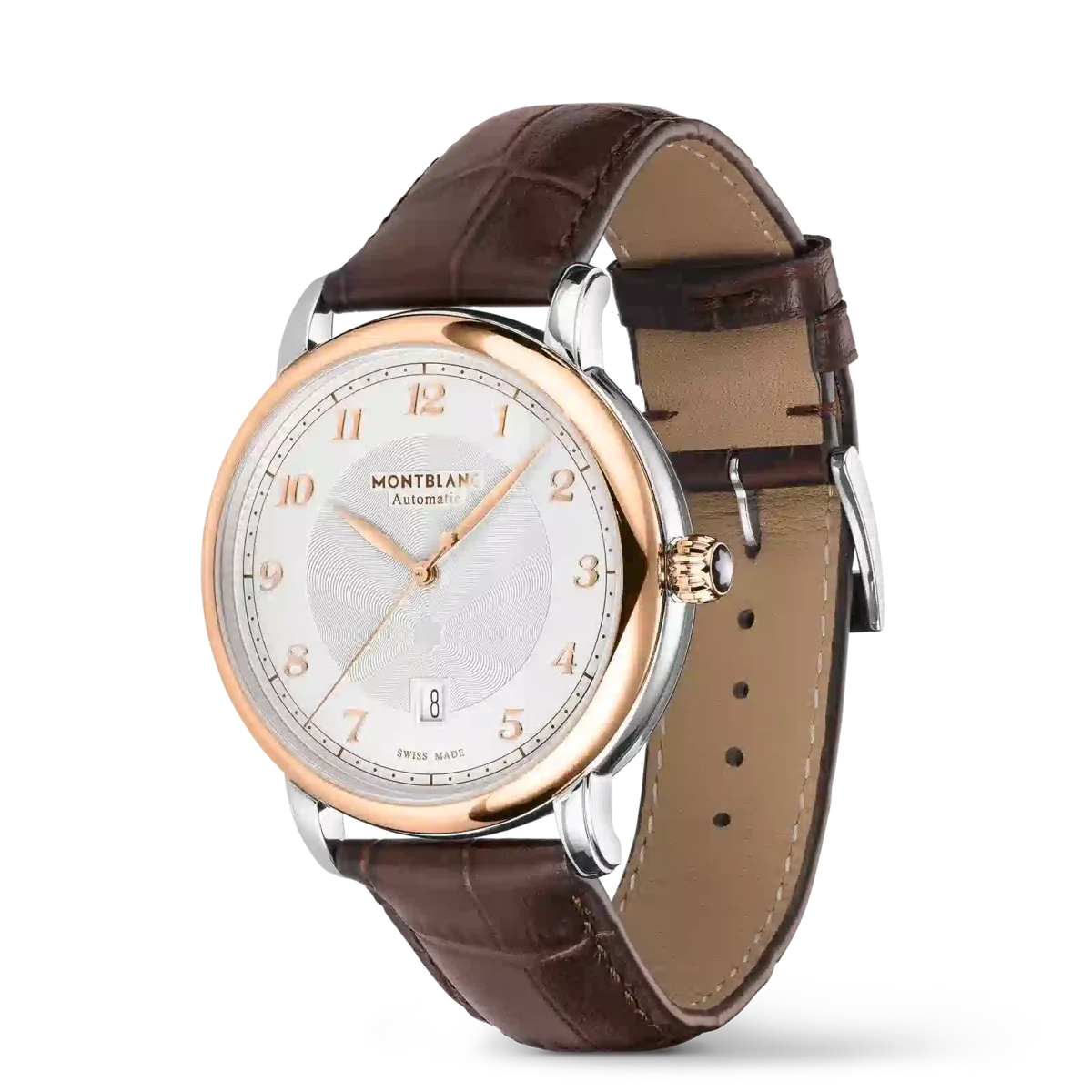 Die Montblanc Star Legacy Kollektion ist inspiriert vom Erbe von Minerva und den Taschenuhren des Unternehmens, die im späten 19. und frühen 20. Jahrhundert hergestellt wurden. Entsprechend den Designvorgaben der Produktlinie verfügt die Montblanc Star Legacy Automatic Date über ein raffiniertes silberweißes Zifferblatt mit dem Montblanc-Guilloché-Muster „Exploding Star“, arabischen Ziffern, blattförmigen Zeigern, einem „Filet Sauté“-Guilloché-Motiv und einer Eisenbahnminuterie. Die Uhr ist mit dem Automatikwerk MB 24.17 ausgestattet und verfügt über eine Stunden-, Minuten- und Sekundenanzeige in der Mitte sowie eine Datumsanzeige in einem Fenster bei 6 Uhr. Sie wird in einem 42-mm-Edelstahlgehäuse mit einer Lünette aus 750/1000 Roségold (18 Karat) geliefert und ist mit einem braunen Kalbslederarmband mit Alligatorprägung ausgestattet.