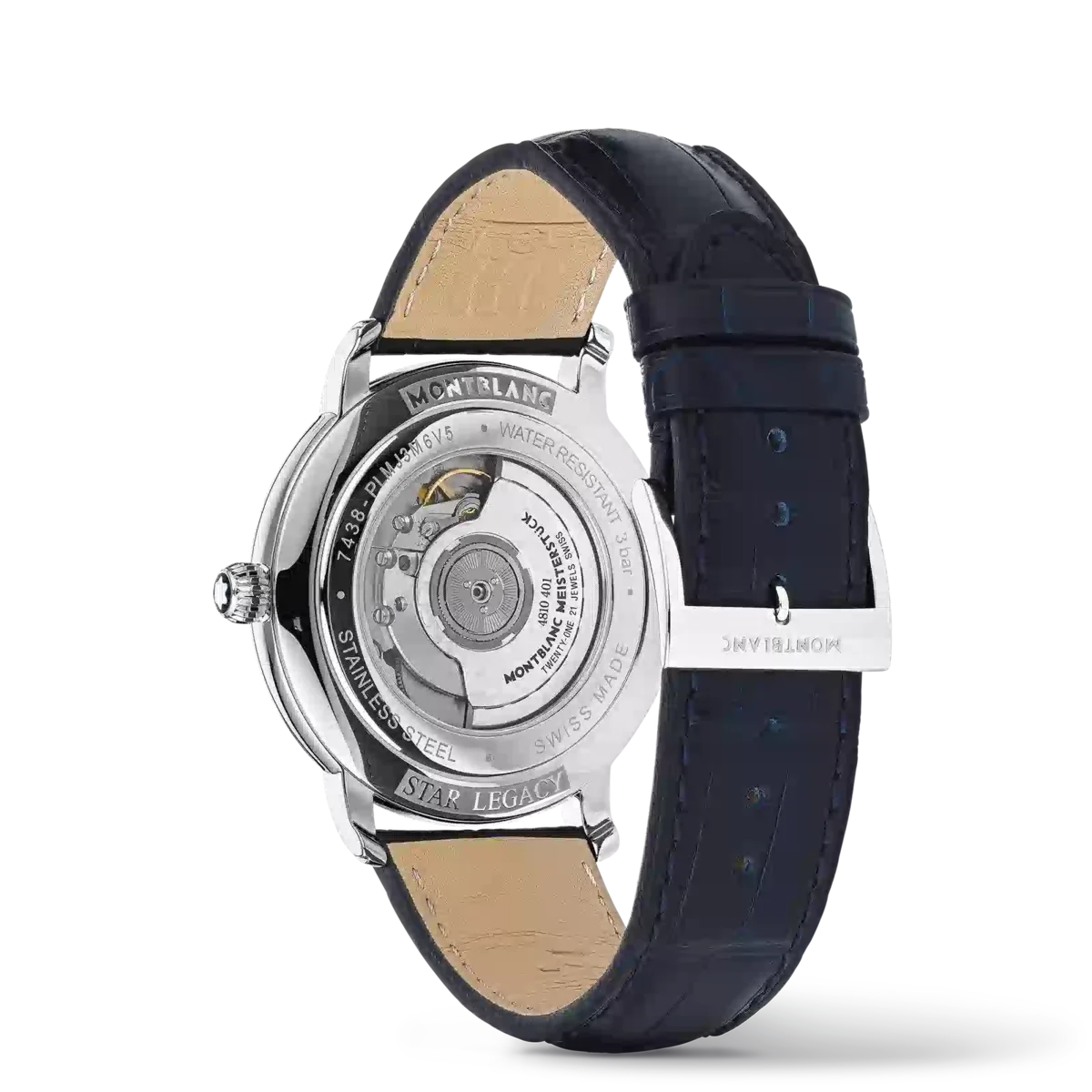 Die Produktlinie Montblanc Star Legacy ist inspiriert vom Erbe von Minerva und den Taschenuhren des Unternehmens, die im späten 19. und frühen 20. Jahrhundert hergestellt wurden. Entsprechend den Designvorgaben der Produktreihe verfügt die Montblanc Star Legacy Automatic Date über ein raffiniertes silberweißes Zifferblatt mit dem Montblanc-Guilloché-Muster „Exploding Star“, römischen Ziffern, blattförmigen Zeigern, einem „Filet Sauté“-Guilloché-Motiv und einer Eisenbahnminuterie. Die Uhr ist mit dem Automatikwerk MB 24.09 ausgestattet und verfügt über eine Stunden-, Minuten- und Sekundenanzeige in der Mitte sowie eine Datumsanzeige in einem Fenster bei 6 Uhr. Er wird in einem 42-mm-Edelstahlgehäuse geliefert und ist mit einem trendigen blauen Sfumato-Alligatorlederarmband ausgestattet. Ident-Nr. MB131209 Bandanstoßbreite 21 mm