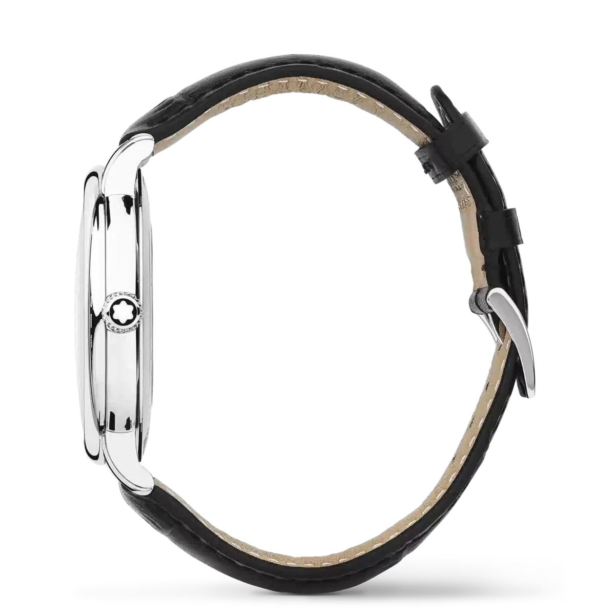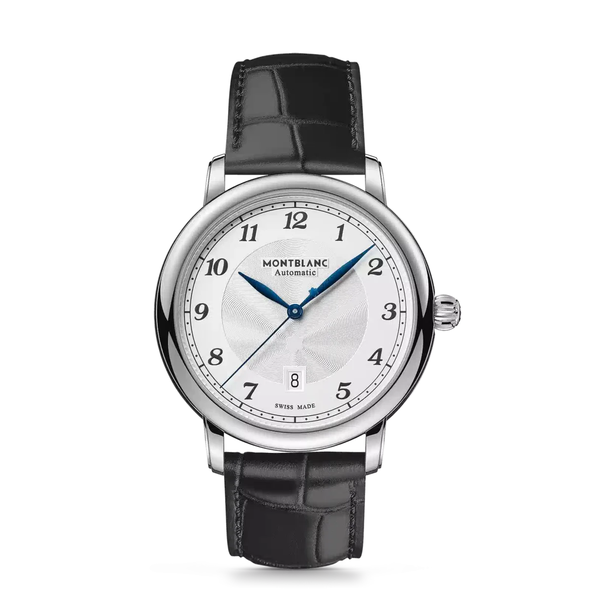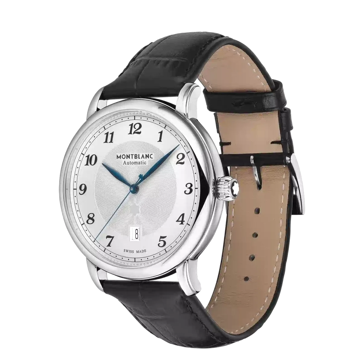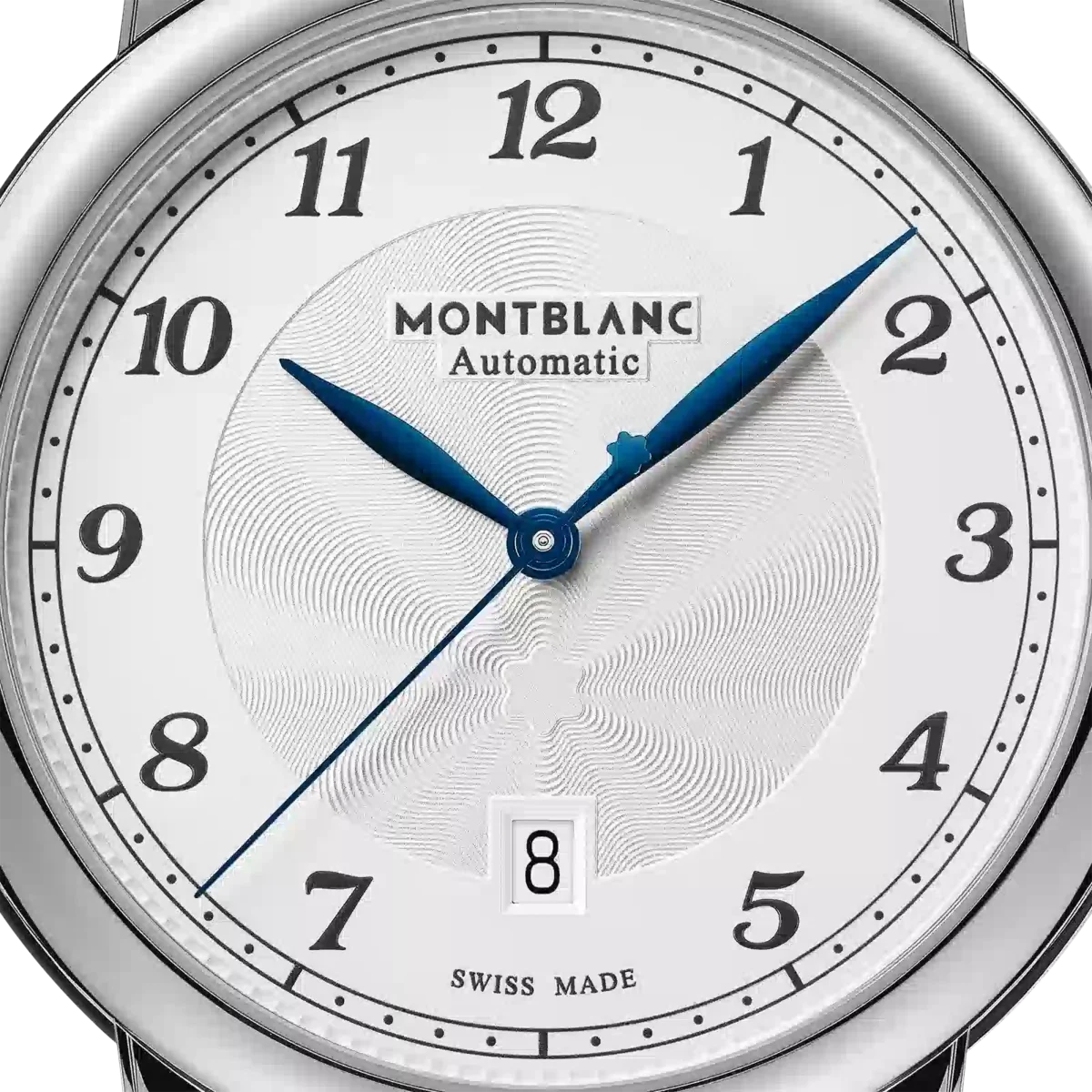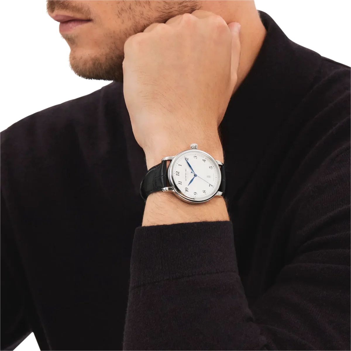 Die Montblanc Star Legacy Kollektion ist inspiriert vom Erbe von Minerva und den Taschenuhren des Unternehmens, die im späten 19. und frühen 20. Jahrhundert hergestellt wurden.Entsprechend den Designvorgaben der Produktlinie verfügt die Montblanc Star Legacy Automatic Date über ein raffiniertes silberweißes Zifferblatt mit dem Montblanc-Guilloché-Muster „Exploding Star“, arabischen Ziffern, blattförmigen Zeigern, einem „Filet Sauté“-Guilloché-Motiv und einer Eisenbahnminuterie. Die Uhr ist mit dem Automatikwerk MB 24.17 ausgestattet und verfügt über eine Stunden-, Minuten- und Sekundenanzeige in der Mitte sowie eine Datumsanzeige in einem Fenster bei 6 Uhr. Sie wird in einem 42-mm-Edelstahlgehäuse geliefert und ist mit einem schwarzen Kalbslederarmband mit Alligatorprägung ausgestattet.