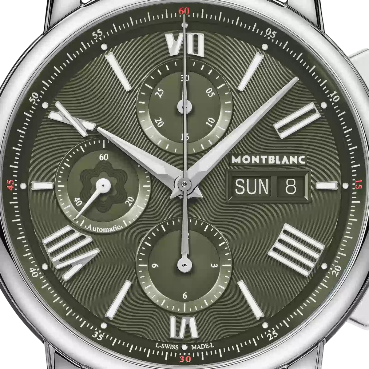 Der Montblanc Star Legacy Chronograph Day & Date Limited Edition in einer Auflage von 800 Stück ist von den Minerva-Taschenuhren aus dem späten 19. und frühen 20. Jahrhundert mit ihren runden, polierten, kieselsteinförmigen Gehäusen und zwiebelförmigen Kronen inspiriert. Das wunderschöne grüne Zifferblatt ist mit dem charakteristischen Exploding-Star-Muster von Montblanc sowie rhodinierten, schwertförmigen Zeigern und Ziffern versehen. Angetrieben wird die Uhr vom Automatikwerk MB 25.07, das über eine Chronographenfunktion, eine Wochentagsanzeige und eine Datumsanzeige verfügt. Diese Uhr ist außerdem mit einem austauschbaren grünen Kalbslederarmband mit Alligatorprägung und ecrufarbenen Nähten ausgestattet.