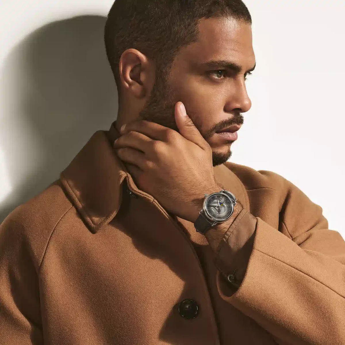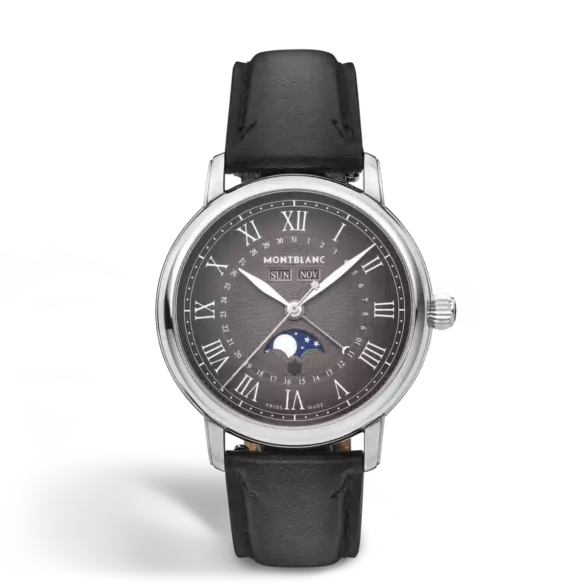 Die Montblanc Star Legacy Full Calendar hebt die edelsten Designmerkmale des Hauses auf ein neues Niveau der Eleganz. Die Uhr verfügt über ein anthrazitfarbenes Sfumato-Zifferblatt mit explodierendem Stern-Guilloché-Motiv, einem Filet Sauté, rhodinierten römischen Ziffern, blattförmigen Zeigern und zeigt auf einfache, elegante Weise die Stunden, Minuten und Sekunden sowie den Tag, das Datum, den Monat und die Mondphase an. Dieses Modell wird vom Automatikwerk MB 24.30 angetrieben und befindet sich in einem 42 mm großen, kieselsteinförmigen Edelstahlgehäuse mit offenem Gehäuseboden, der den Blick auf die mit dem Montblanc Emblem verzierte Schwungmasse freigibt. Das austauschbare Armband aus anthrazitfarbenem Kalbsleder wurde speziell von Marco Tomasetta, dem künstlerischen Leiter von Montblanc, entworfen, der sich von den Federn der Schreibgeräte des Hauses inspirieren ließ, die sich durch ihre spitze Form auszeichnen und durch einen vertikalen Sfumato-Effekt veredelt sind. Ident-Nr. MB134358