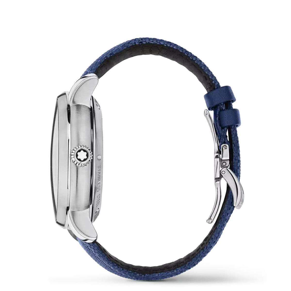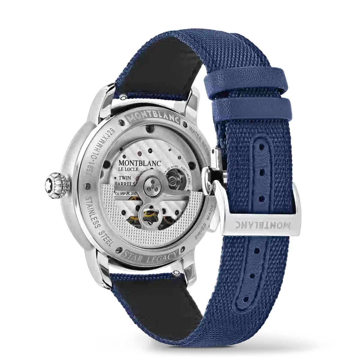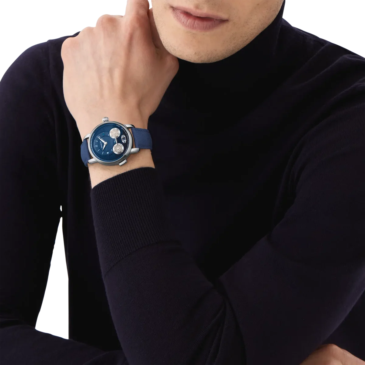 Der Montblanc Star Legacy Nicolas Rieussec Monopusher Chronograph wird vom Manufakturwerk MB R200 angetrieben und verfügt über ein 43-mm-Edelstahlgehäuse mit blauem Zifferblatt, rhodinierten Zeigern und silberweißen Indizes. Dieses neue Modell weist mehrere Details auf, die die historische Verbindung zu Paris unterstreichen – wo die Geschichte der Montblanc-Chronographen auf der Pferderennbahn Champ-de-Mars begann –, darunter ein Clou-de-Paris-Motiv auf dem Zifferblatt, das sich auf der Schwungmasse und dem Textilarmband fortsetzt. Dieses Motiv stammt aus dem geometrischen Design der gepflasterten Straßen von Paris und ist das Bindeglied zwischen der Vergangenheit und der Zukunft dieser Uhr.