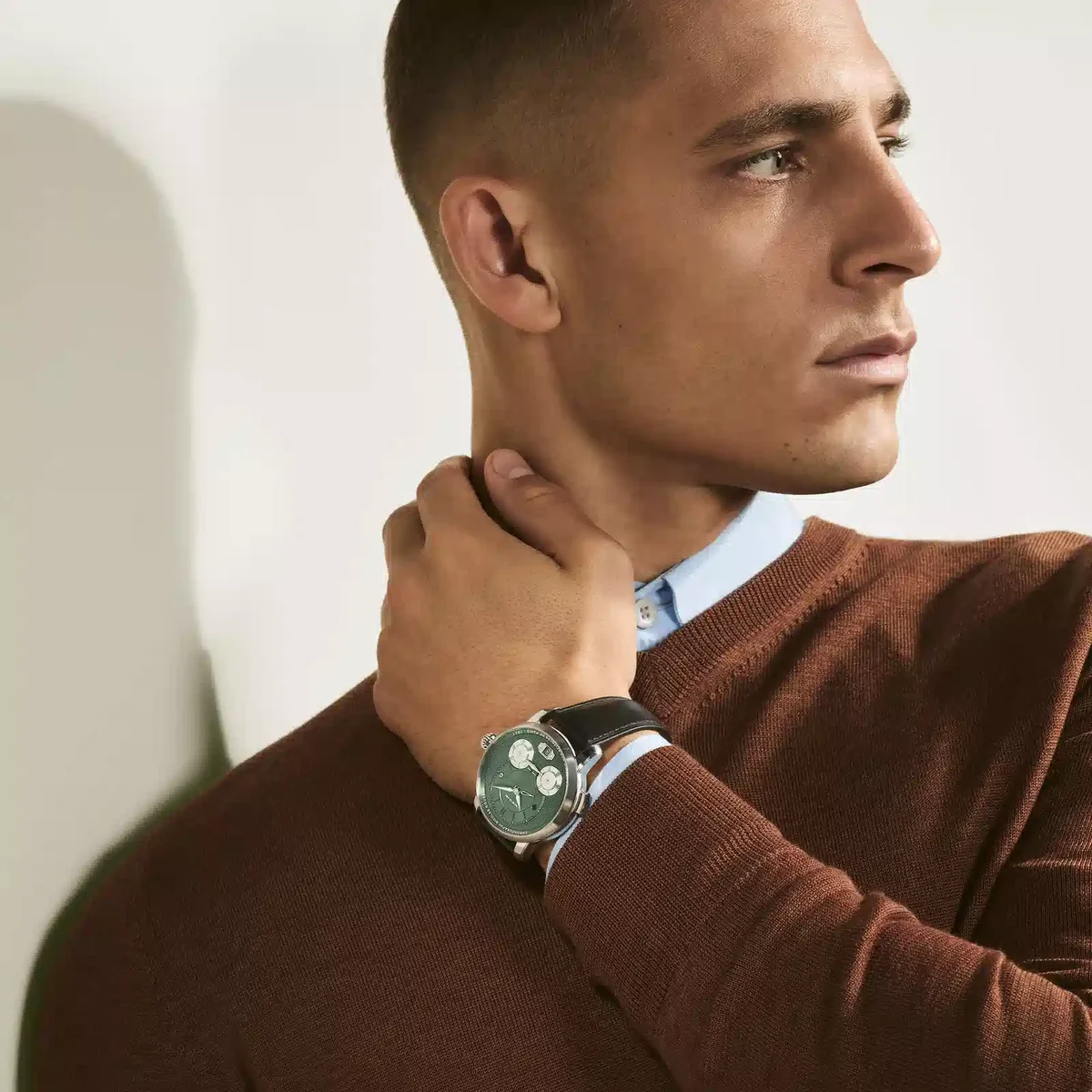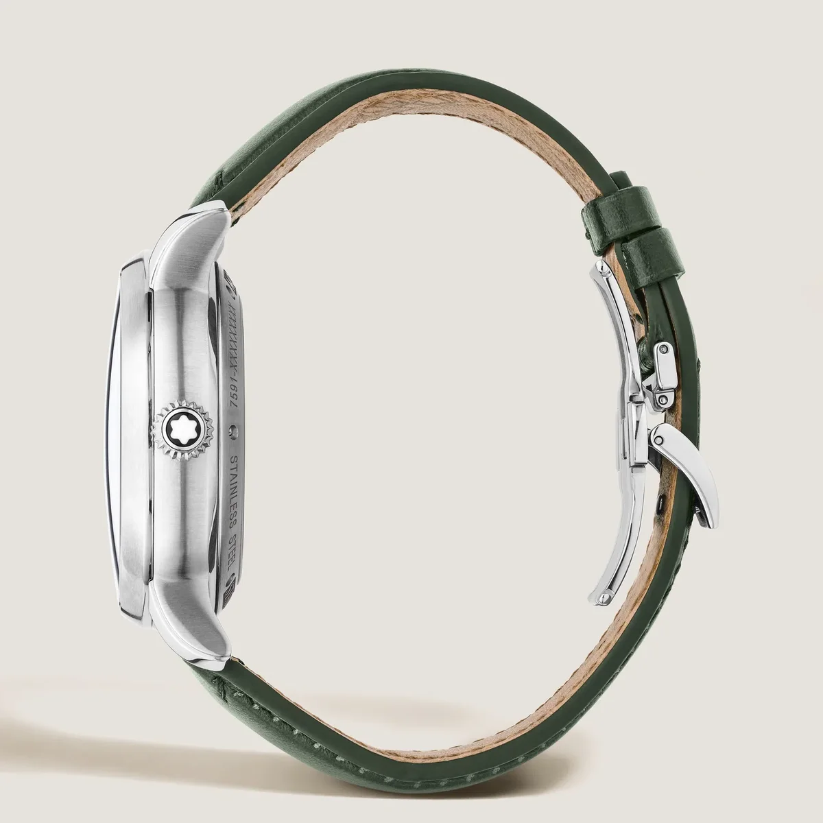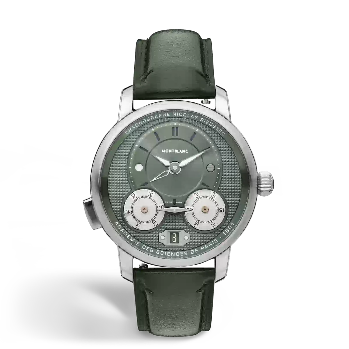 Der Montblanc Star Legacy Nicolas Rieussec Chronograph unterstreicht die Verbindung zu Paris mit vielen Elementen, die die Stadt der Lichter zelebrieren. Das grafische Clous-de-Paris-Motiv auf dem eleganten grünen Zifferblatt stammt aus dem geometrischen Design der gepflasterten Straßen von Paris und setzt sich auf der Schwungmasse fort. Auf dem Flansch sind die französischen Begriffe „Académie des Sciences de Paris” und „Chronographe Nicolas Rieussec” eingraviert, um daran zu erinnern, dass die Akademie Rieussecs Erfindung im Jahr 1821 validierte. Das Futter des Armbands wurde ebenfalls mit einer Karte von Paris aus dem Jahr 1821 verziert. Das grüne, austauschbare Kalbslederarmband wurde speziell von Marco Tomasetta, dem künstlerischen Leiter von Montblanc, entworfen, der sich für die spitze Form von den Federn der Schreibgeräte des Hauses inspirieren ließ. Die Uhr verfügt über ein 43-mm-Edelstahlgehäuse und wird von dem automatischen Manufaktur-Monopusher-Chronographenwerk MB R200 angetrieben. Ident-Nr. MB132947 Bandanstoßbreite 21 mm