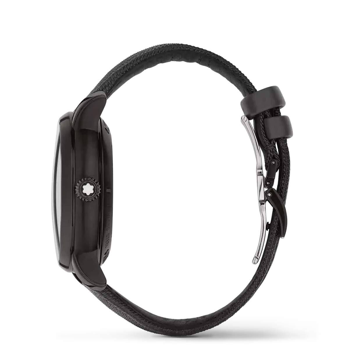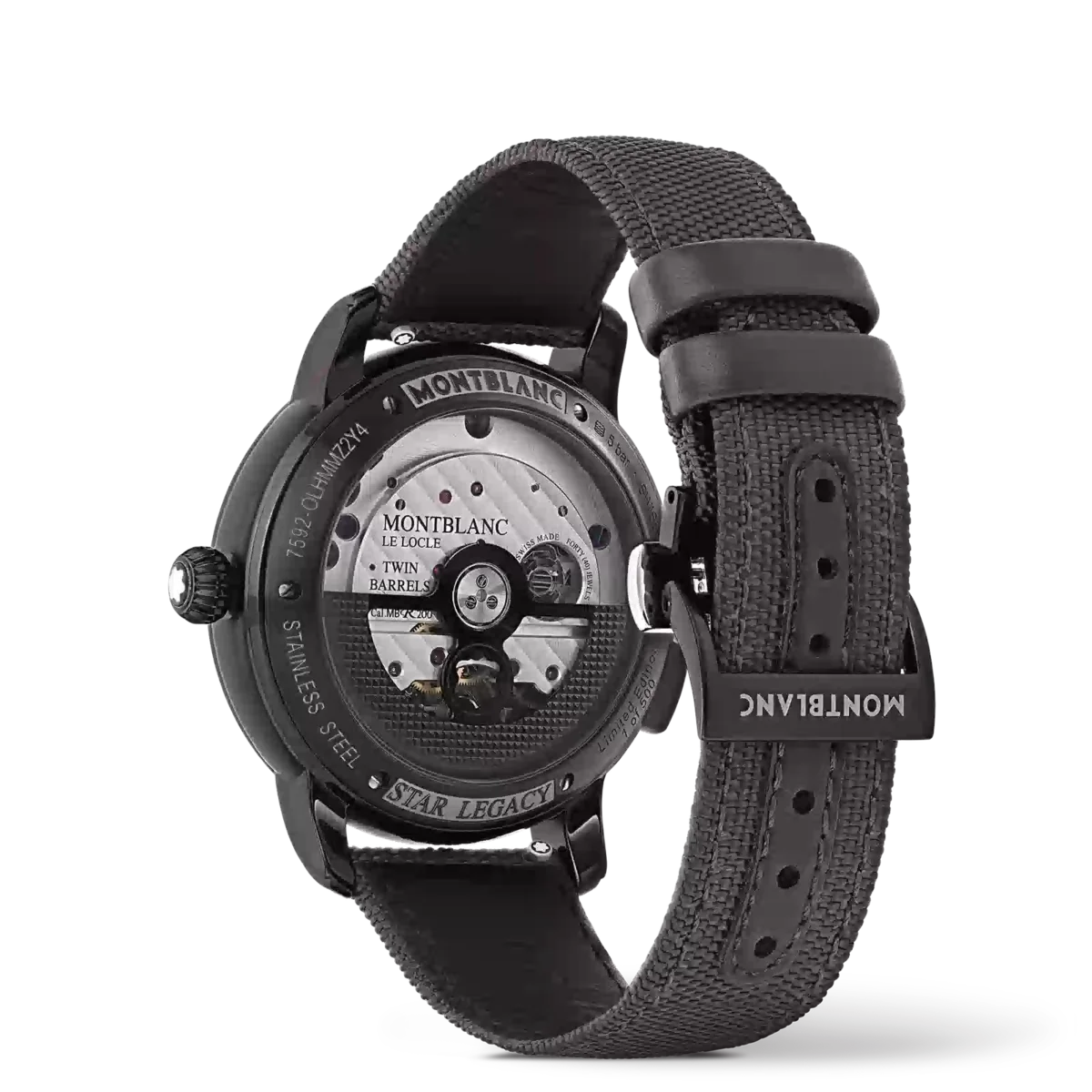 Der Montblanc Star Legacy Nicolas Rieussec Monopusher Chronograph Limited Edition mit einer Auflage von 500 Stück wird vom Manufakturwerk MB R200 angetrieben und verfügt über ein 43-mm-Edelstahlgehäuse mit schwarzer DLC-Beschichtung, anthrazitfarbenem Zifferblatt, roségoldbeschichteten Zeigern und schwarzen Indizes. Dieses neue Modell weist mehrere Details auf, die die historische Verbindung zu Paris unterstreichen – wo die Geschichte der Montblanc-Chronographen auf der Pferderennbahn Champ-de-Mars begann –, darunter ein Clou-de-Paris-Motiv auf dem Zifferblatt, das sich auf der Schwungmasse und dem Textilarmband fortsetzt. Dieses Motiv stammt aus dem geometrischen Design der gepflasterten Straßen von Paris und ist das Bindeglied zwischen der Vergangenheit und der Zukunft dieser Uhr.