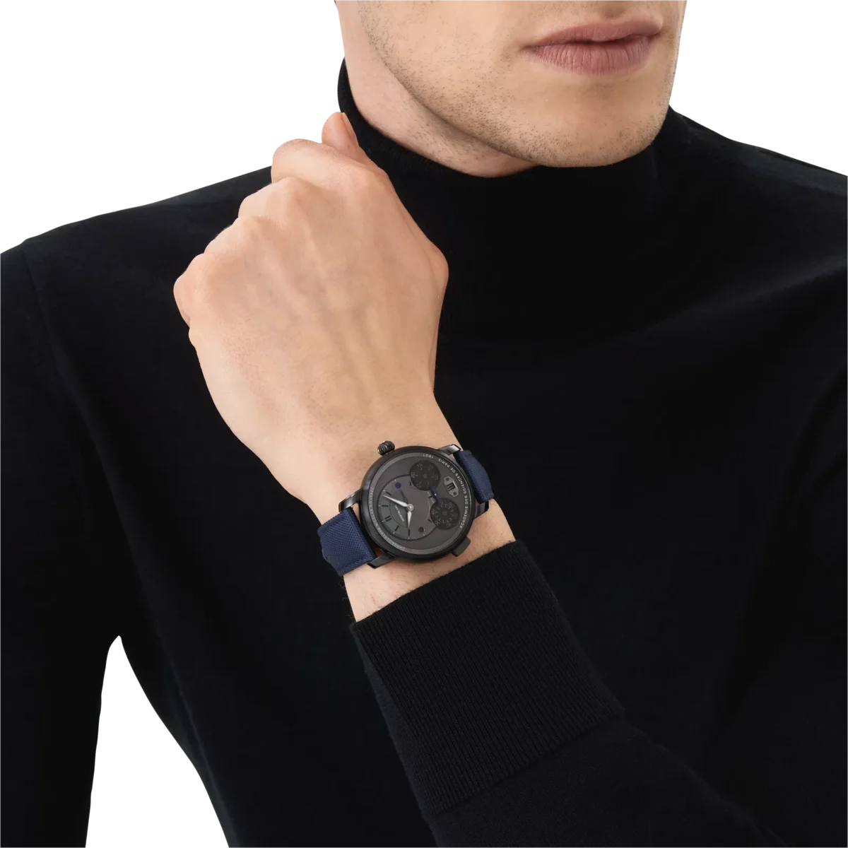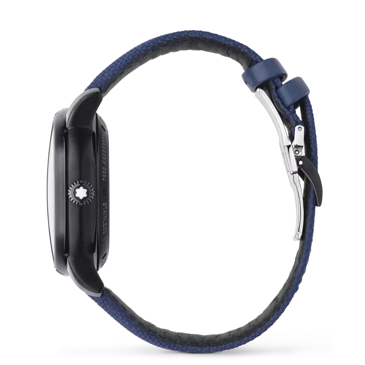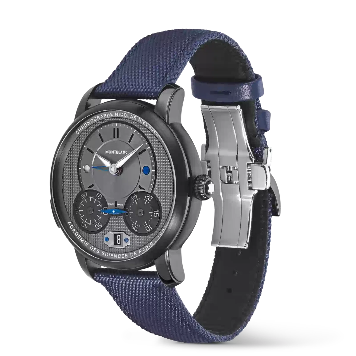 Die Montblanc Star Legacy Nicolas Rieussec Chronograph 43 mm Limited Edition ist eine Hommage an die Erfindung des Tintenchronographen, der erstmals 1821 von Nicolas Rieussec in Paris getestet und von der Académie des Sciences validiert wurde. Diese neue Version verfügt über ein 43 mm großes DLC-beschichtetes Edelstahlgehäuse mit schwarzem Zifferblatt. Clou-de-Paris-Motive zieren das Zifferblatt, die Schwungmasse und das blaue Textilarmband und erinnern an die gepflasterten Straßen von Paris. Zu den Funktionen gehören ein Chronograph, eine Tag- und Nachtanzeige, eine zweite Zeitzone und ein Datum. Der Zeitmesser wird vom Monopusher-Chronographenwerk MB R200 Montblanc Manufacture angetrieben und ist auf 500 Stück limitiert. Ident-Nr. MB129763 Bandanstoßbreite 21 mm