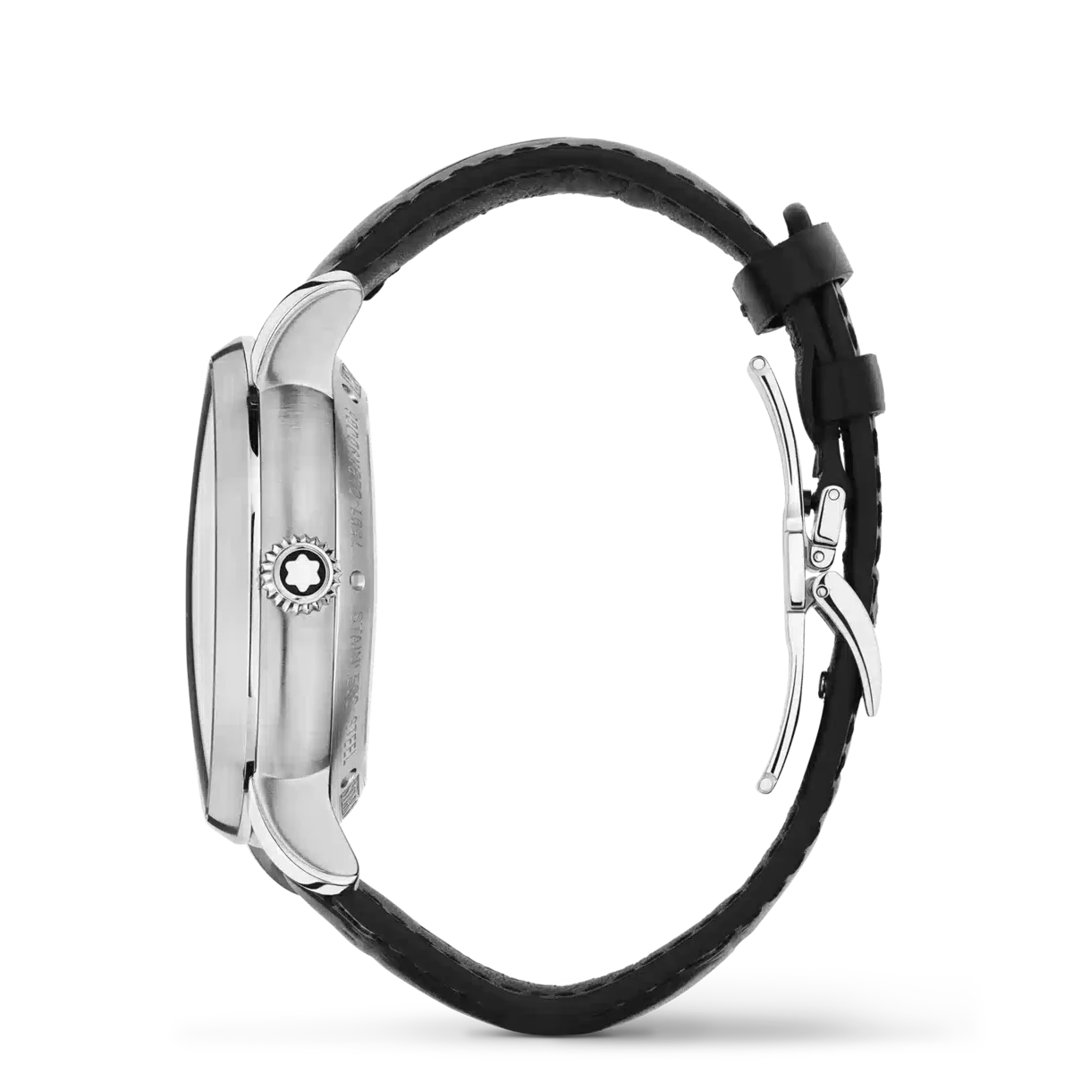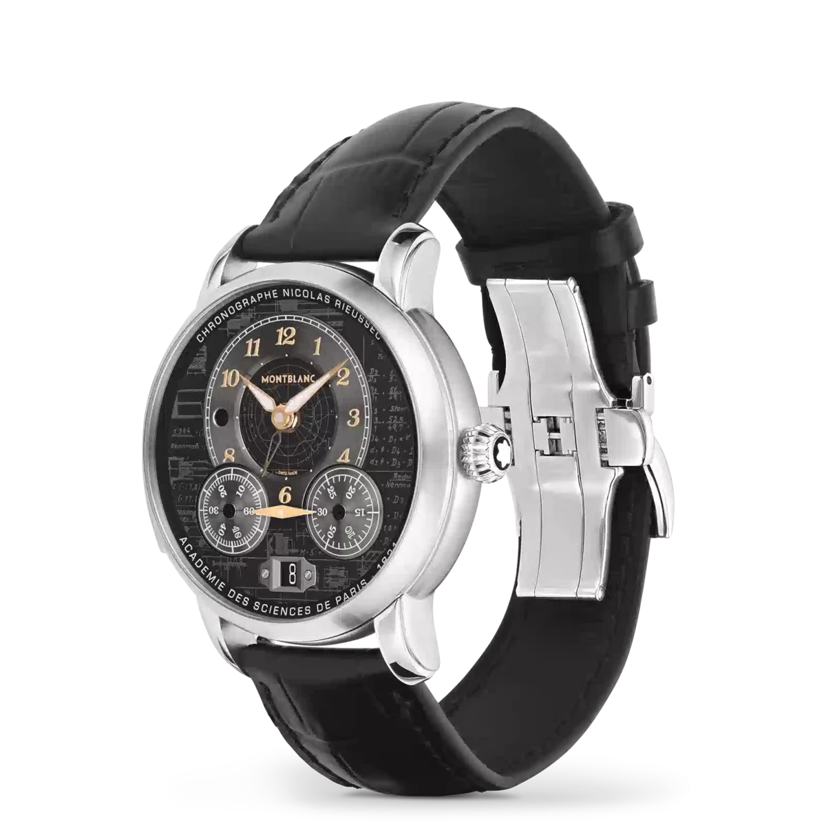 Der Montblanc Star Legacy Nicolas Rieussec Chronograph feiert das 100-jährige Jubiläum des berühmten Meisterstück-Schreibgeräts von Montblanc mit Designelementen des ikonischen Füllfederhalters. Die auf 500 Stück limitierte Uhr verfügt über ein 43-mm-Edelstahlgehäuse und ein austauschbares schwarzes Kalbslederarmband mit Alligatorprägung. Das schwarze Zifferblatt ist mit einer Leuchtdruckbeschriftung verziert, die einen Entwurf des Schreibgeräts aus dem Jahr 1920 und Pläne aus der Maßtabelle des schneebedeckten Montblanc-Emblems zeigt, das sich auf der Spitze jeder Meisterstück-Kappe und auf der Krone der Montblanc-Uhren befindet. Die bedeutende Zahl 4810, die untrennbar mit Meisterstück verbunden ist, befindet sich ebenfalls auf dem Zifferblatt, oberhalb der beiden drehbaren gewölbten Chronographenscheiben. Eine Vielzahl goldener Akzente auf dem Zifferblatt in Kombination mit dem Edelstahl des Gehäuses erinnern ebenfalls an das zweifarbige Design der Meisterstück-Feder. Dreht man die Uhr um, kann man durch den Gehäuseboden die Schwungmasse des Manufaktur-Monopusher-Chronographenwerks MB R200 sehen, die mit einer zarten 8 eine Anspielung auf die Welt der Handschrift darstellt – ein Symbol, das von kalligraphischen Bewegungen inspiriert ist.