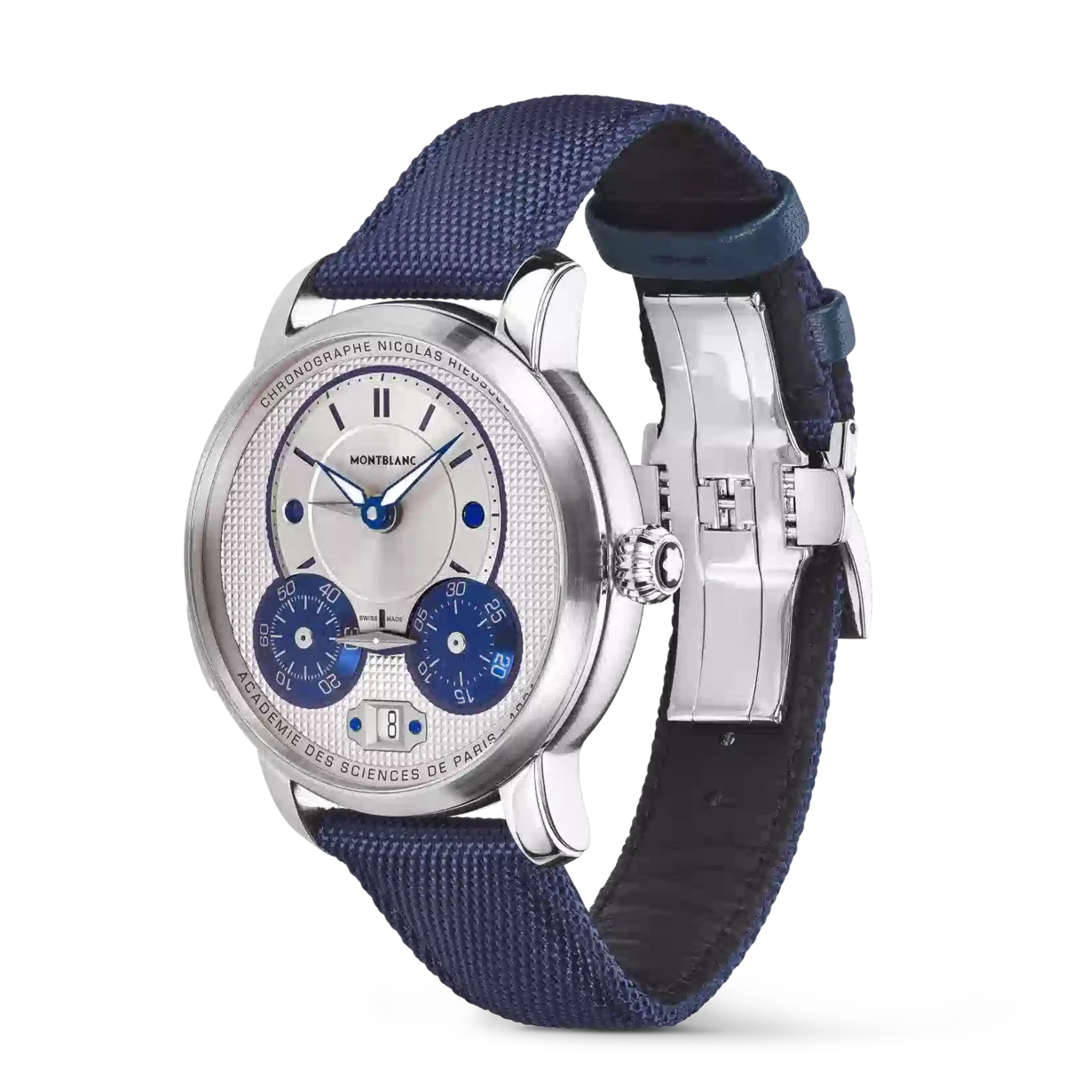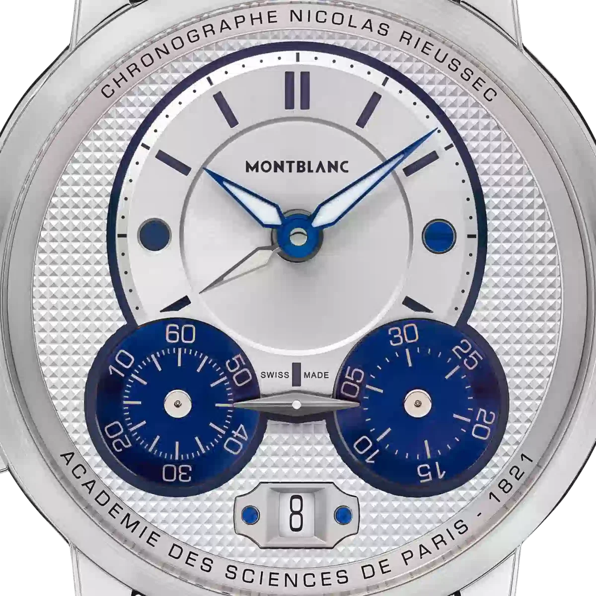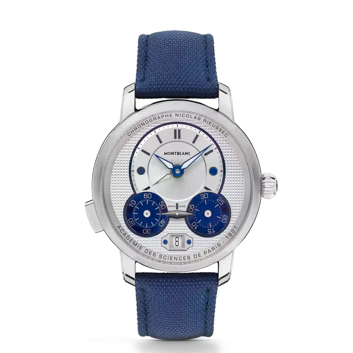 Der Montblanc Star Legacy Nicolas Rieussec Chronograph 43 mm ist eine Hommage an die Erfindung des Tintenchronographen, der erstmals 1821 von Nicolas Rieussec in Paris getestet und von der Académie des Sciences validiert wurde. Diese neue Version verfügt über ein 43-mm-Edelstahlgehäuse mit einem grau-blauen Zifferblatt. Clou-de-Paris-Motive zieren das Zifferblatt, die Schwungmasse und das blaue Textilarmband und erinnern an die gepflasterten Straßen von Paris. Zu den Funktionen gehören ein Chronograph, eine Tag- und Nachtanzeige, eine zweite Zeitzone und ein Datum. Angetrieben wird die Uhr vom Monopusher-Chronographenwerk MB R200 aus der Montblanc-Manufaktur. Ident-Nr. MB129764 Bandanstoßbreite 21 mm