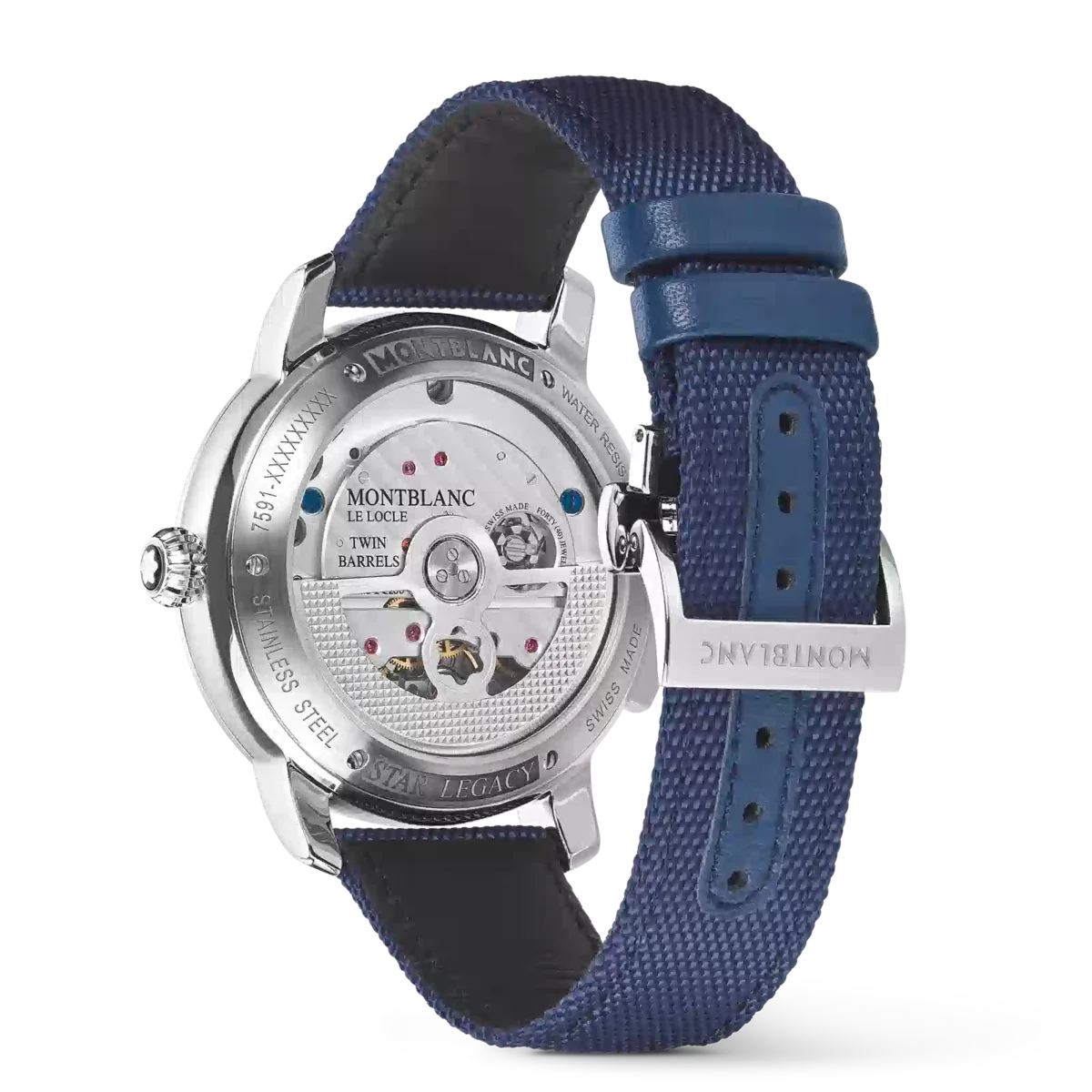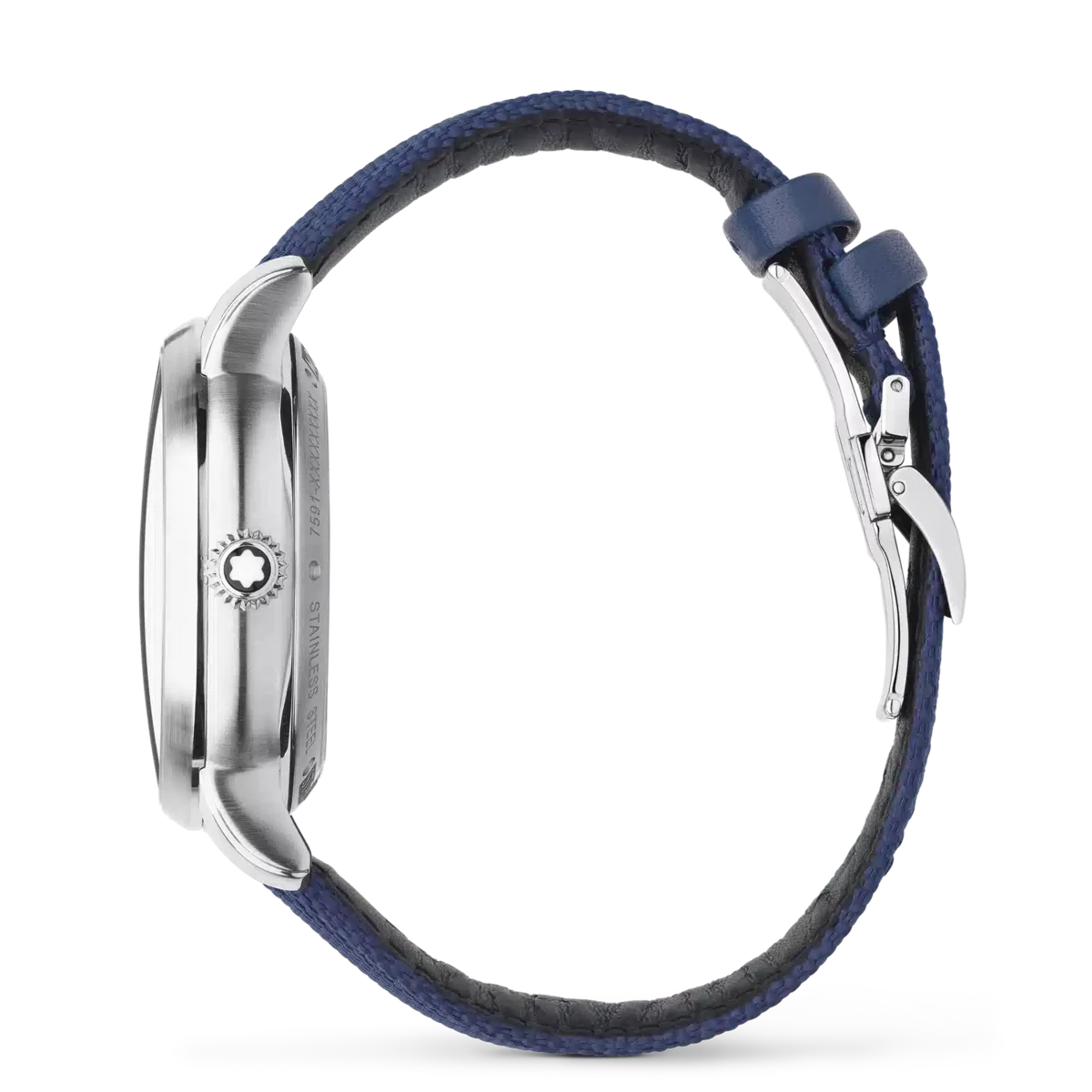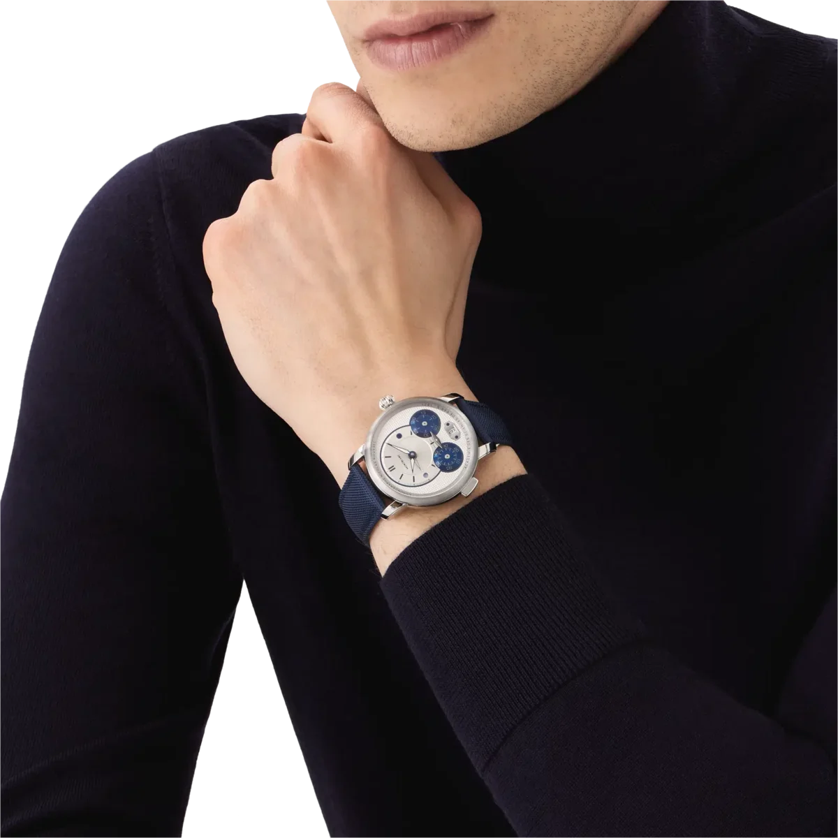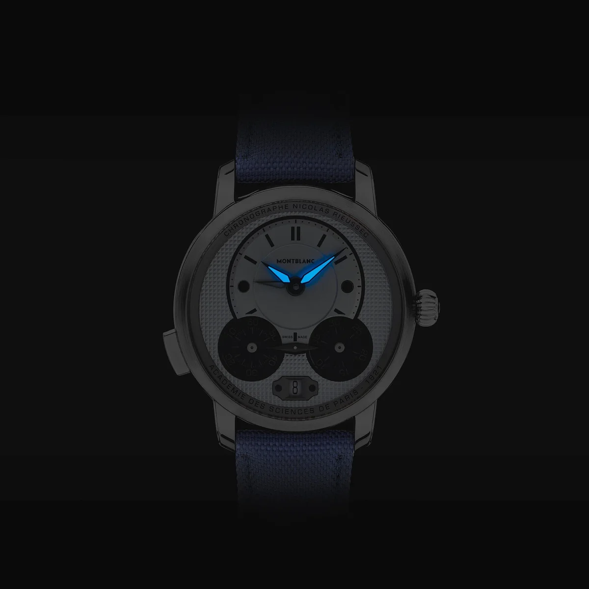 Der Montblanc Star Legacy Nicolas Rieussec Chronograph 43 mm ist eine Hommage an die Erfindung des Tintenchronographen, der erstmals 1821 von Nicolas Rieussec in Paris getestet und von der Académie des Sciences validiert wurde. Diese neue Version verfügt über ein 43-mm-Edelstahlgehäuse mit einem grau-blauen Zifferblatt. Clou-de-Paris-Motive zieren das Zifferblatt, die Schwungmasse und das blaue Textilarmband und erinnern an die gepflasterten Straßen von Paris. Zu den Funktionen gehören ein Chronograph, eine Tag- und Nachtanzeige, eine zweite Zeitzone und ein Datum. Angetrieben wird die Uhr vom Monopusher-Chronographenwerk MB R200 aus der Montblanc-Manufaktur. Ident-Nr. MB129764 Bandanstoßbreite 21 mm
