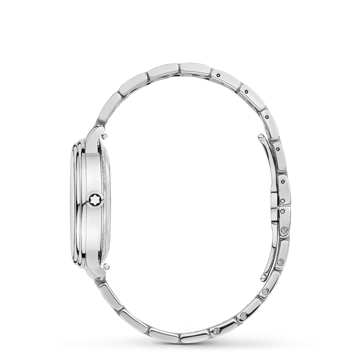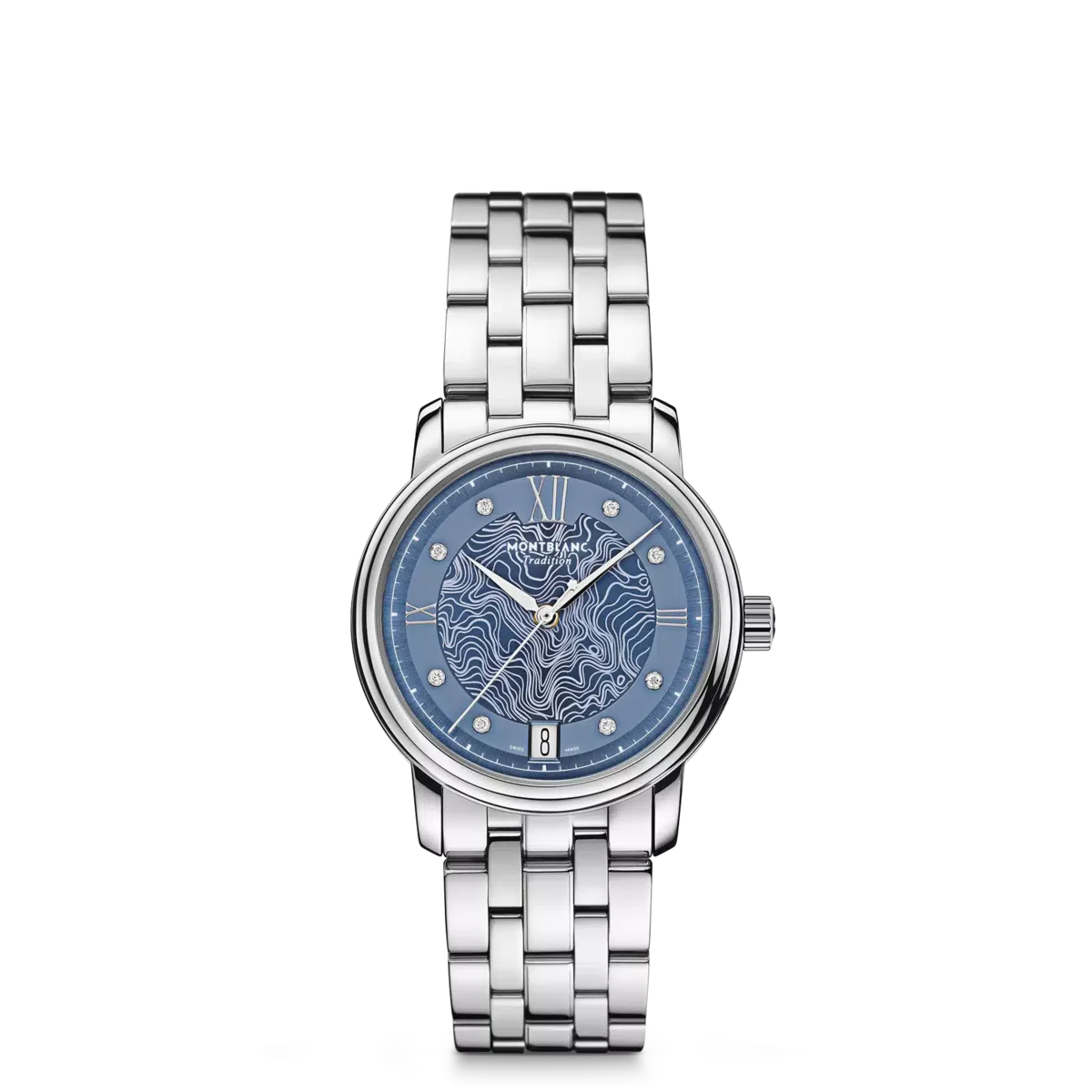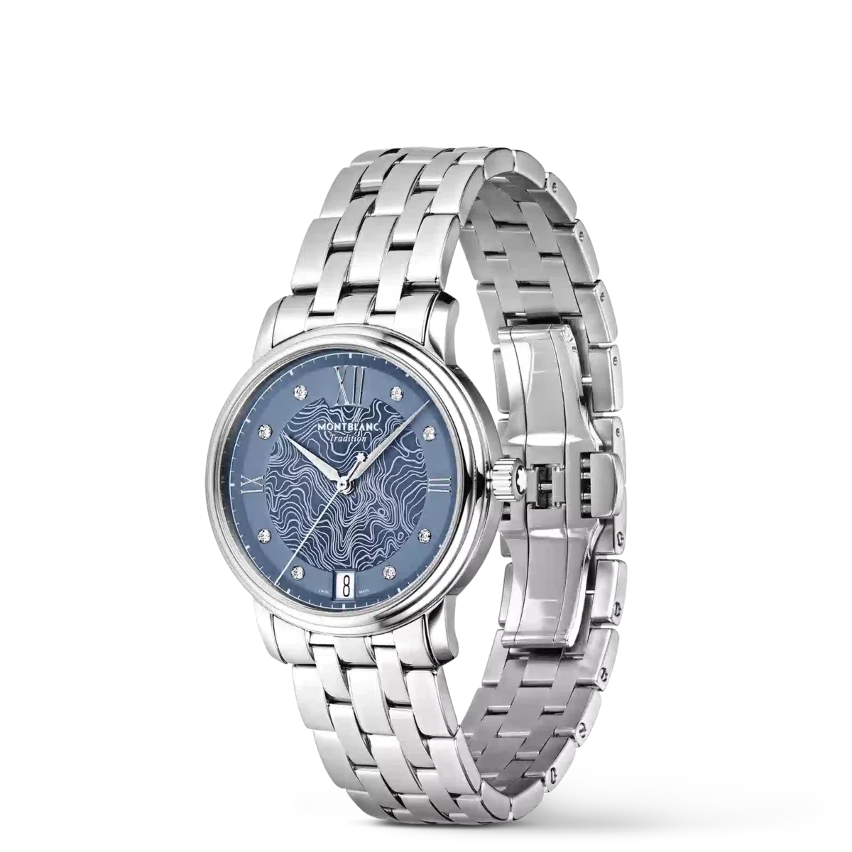 Die Montblanc Tradition Automatic Date verfügt über ein 32-mm-Edelstahlgehäuse mit geraden Bandanstößen und einer doppelt geformten Lünette. Die Uhr verfügt über ein blaues Zifferblatt, das die Topografie des Mont Blanc mit Diamantindexen, silberfarbenen römischen Ziffern und einer markanten römischen „XII” darstellt. Die schwertförmigen Stunden- und Minutenzeiger, der Sekundenzeiger und die Krone mit Montblanc-Emblem sowie das austauschbare Edelstahlarmband runden das zeitgemäße, elegante Erscheinungsbild ab.