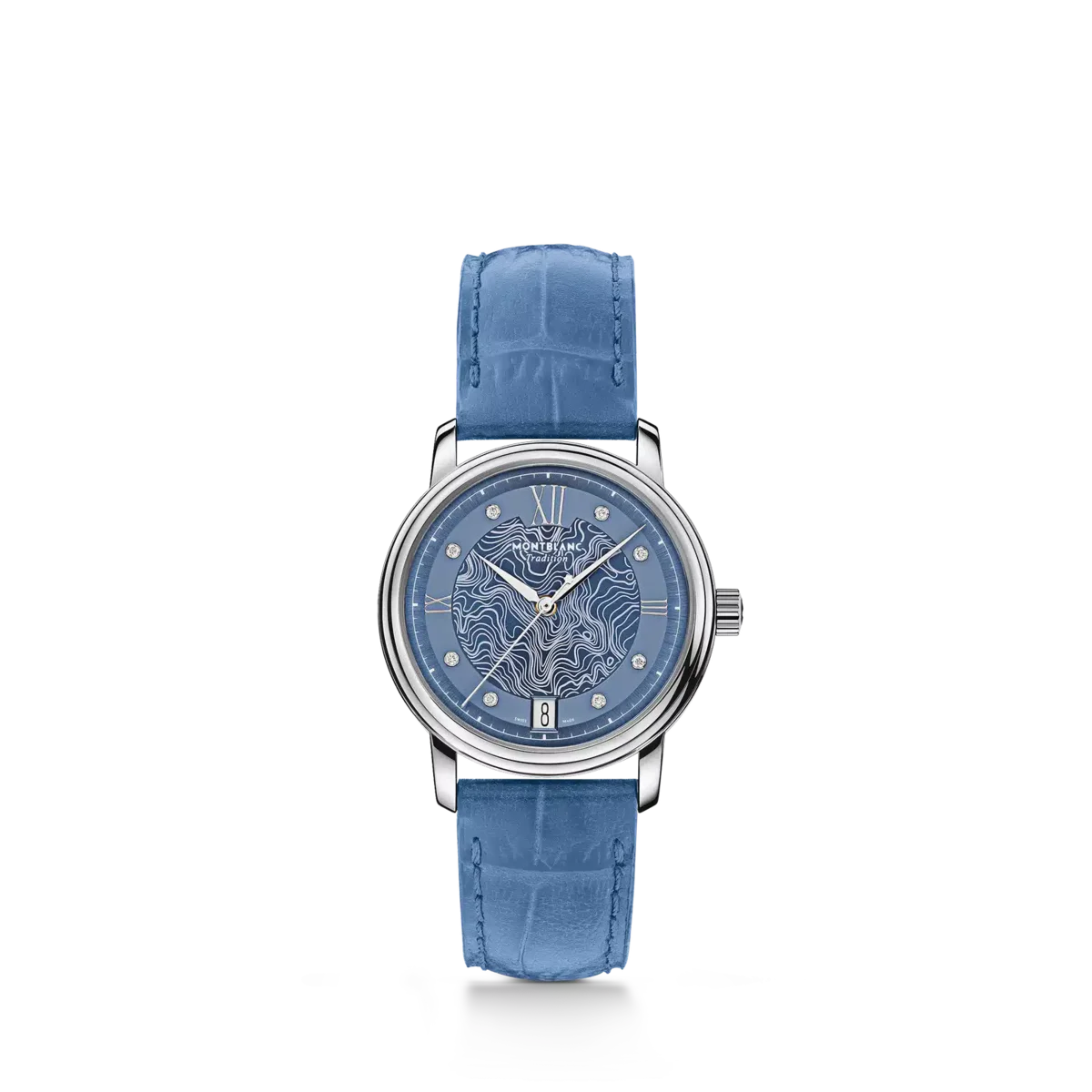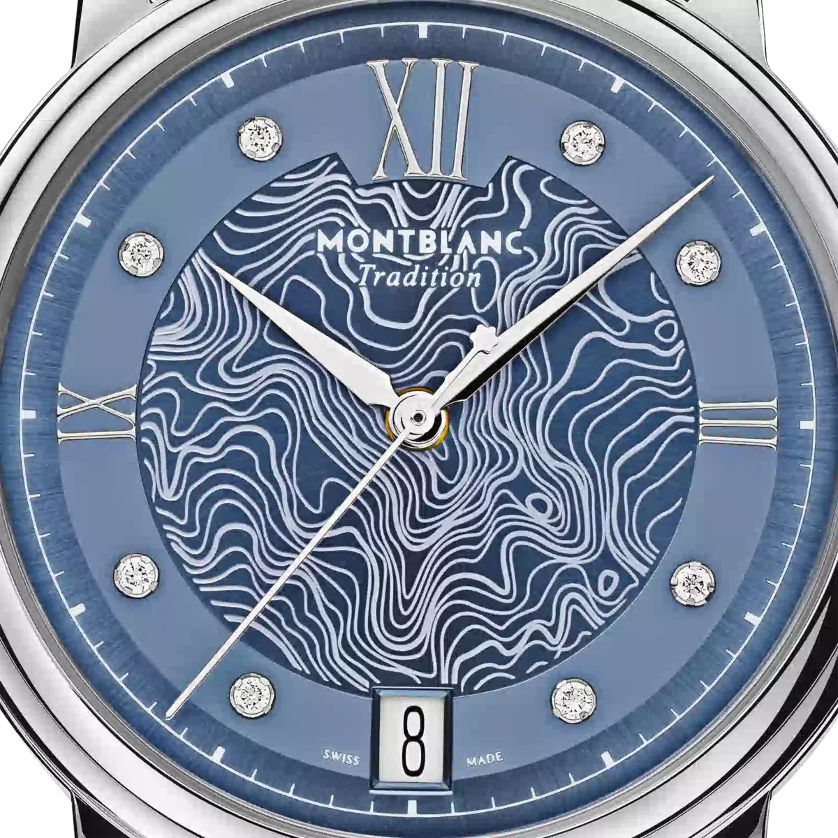 Die Montblanc Tradition Automatic Date verfügt über ein 32-mm-Edelstahlgehäuse mit geraden Bandanstößen und einer doppelt geformten Lünette. Die Uhr hat ein blaues Zifferblatt, das die Topografie des Mont Blanc mit Diamantindexen, silberfarbenen römischen Ziffern und einer markanten römischen „XII” darstellt. Die schwertförmigen Stunden- und Minutenzeiger, der Sekundenzeiger und die Krone mit Montblanc Emblem sowie das blaue, austauschbare Kalbslederarmband runden das zeitgemäße, elegante Erscheinungsbild ab.