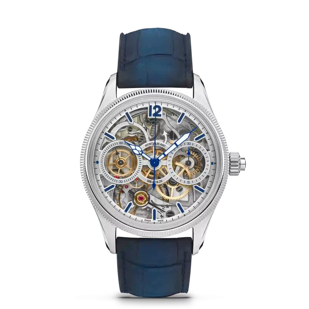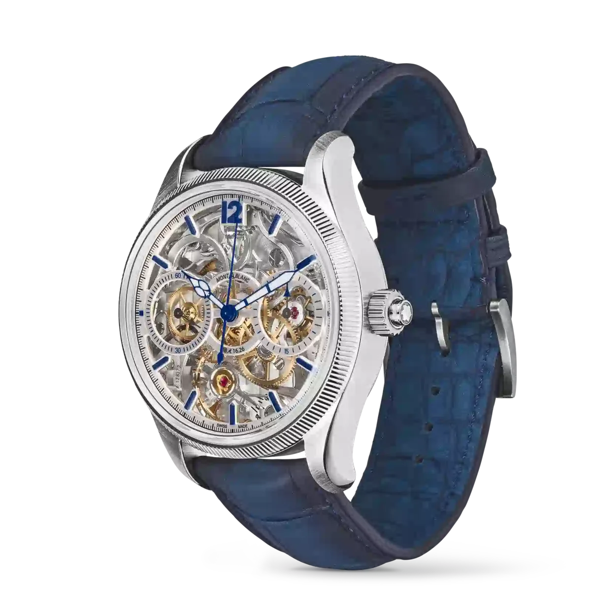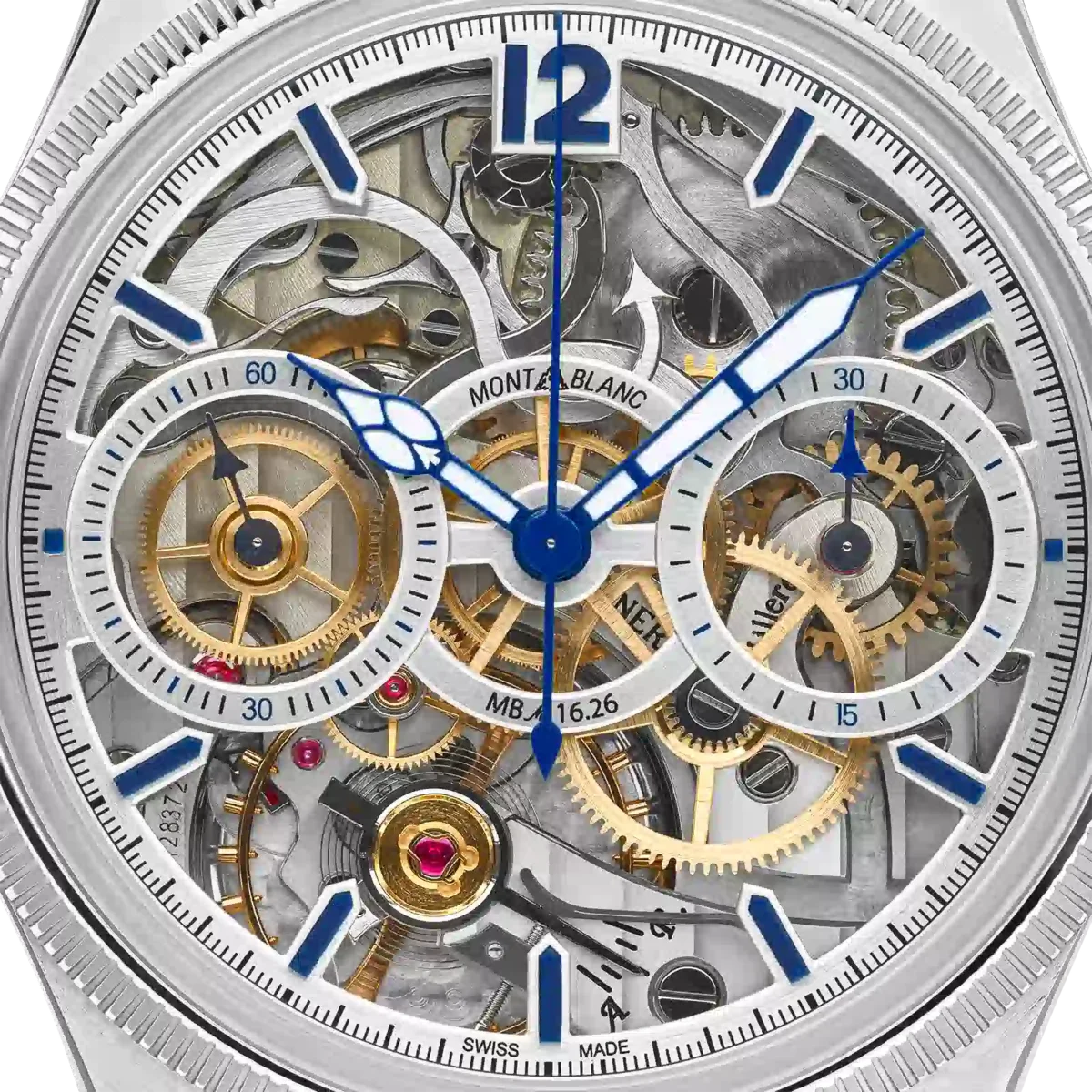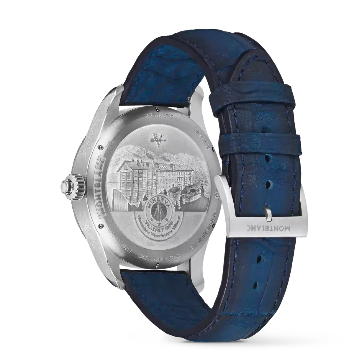 Die Montblanc 1858 The Unveiled Secret Minerva Monopusher Chronograph Limited Edition bietet einen ungehinderten Blick auf das Manufakturkaliber MB M16.29 der Maison, das umgedreht wurde, um die ganze Faszination des Chronographenwerks zu offenbaren. Ein Uhrwerk umzudrehen klingt einfach, ist jedoch eine technische Meisterleistung, da auch die Richtung der Zeiger umgekehrt werden muss. Diese auf 58 Stück limitierte Edition verfügt über ein 43-mm-Edelstahlgehäuse mit einer geriffelten Lünette aus 750/1000 Weißgold (18 Karat) und ist mit blauen Zeigern und Indizes sowie einem blauen Alligatorlederarmband ausgestattet.