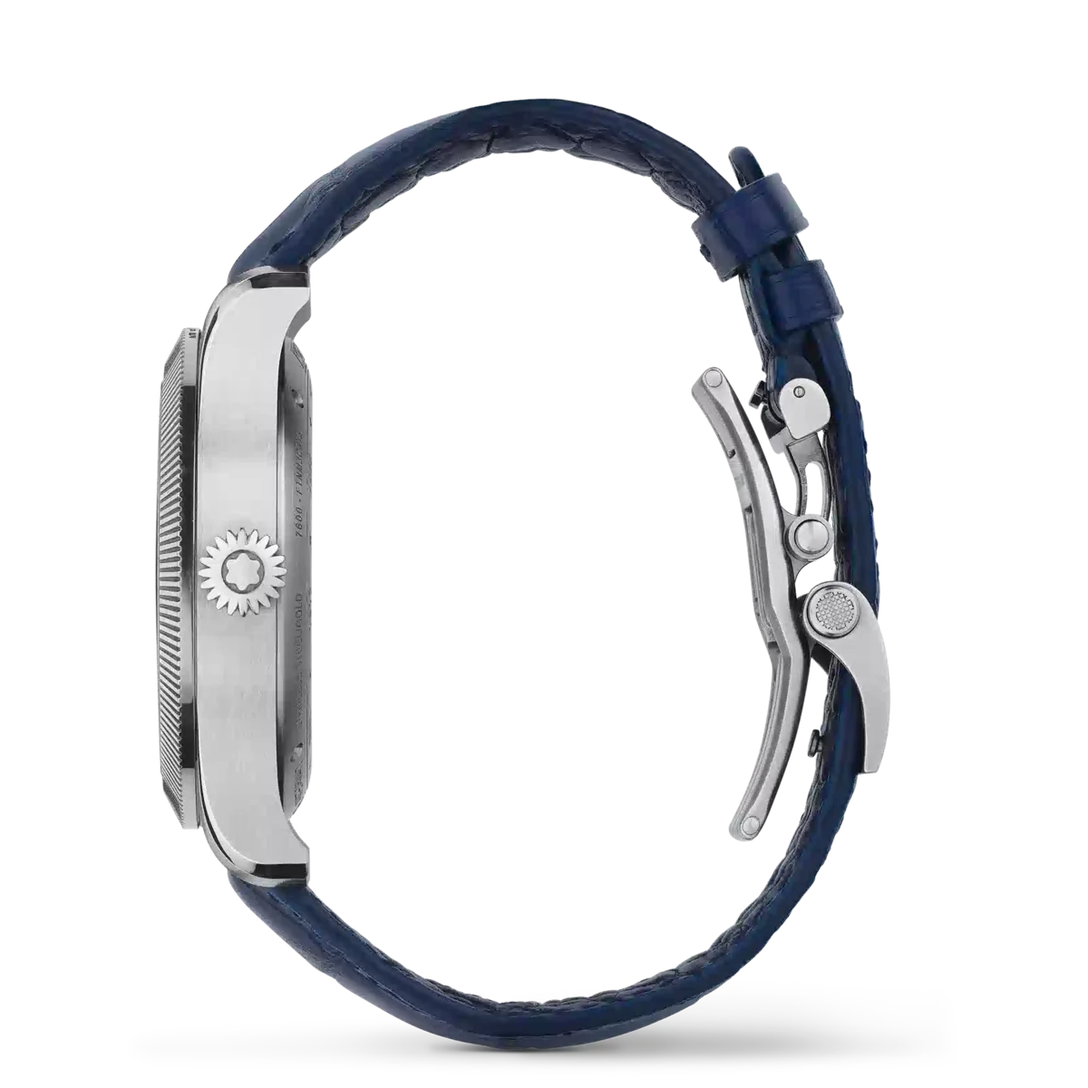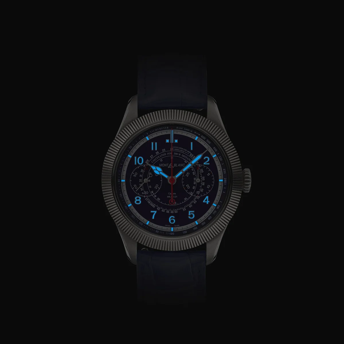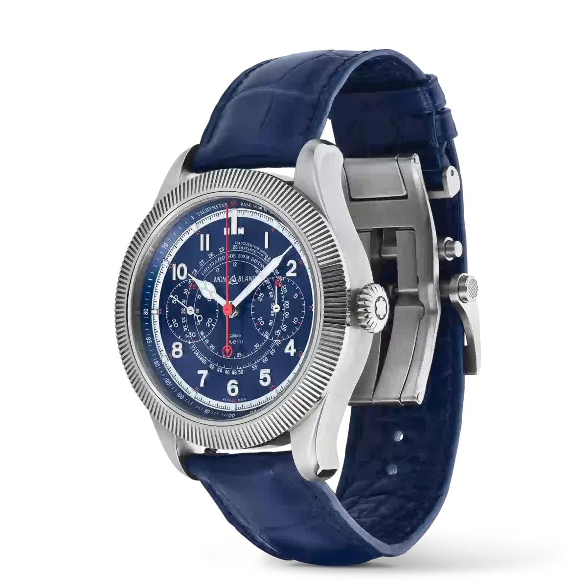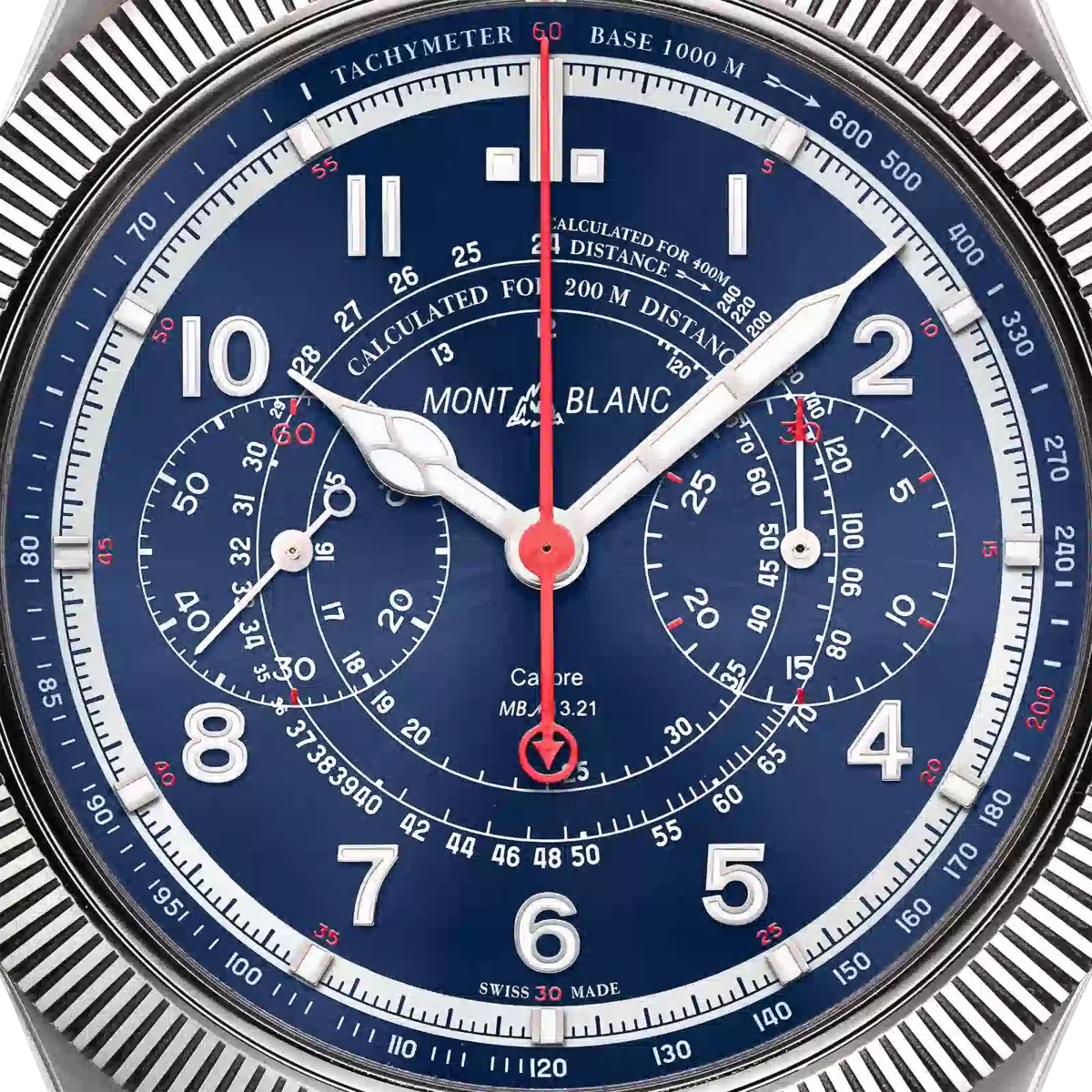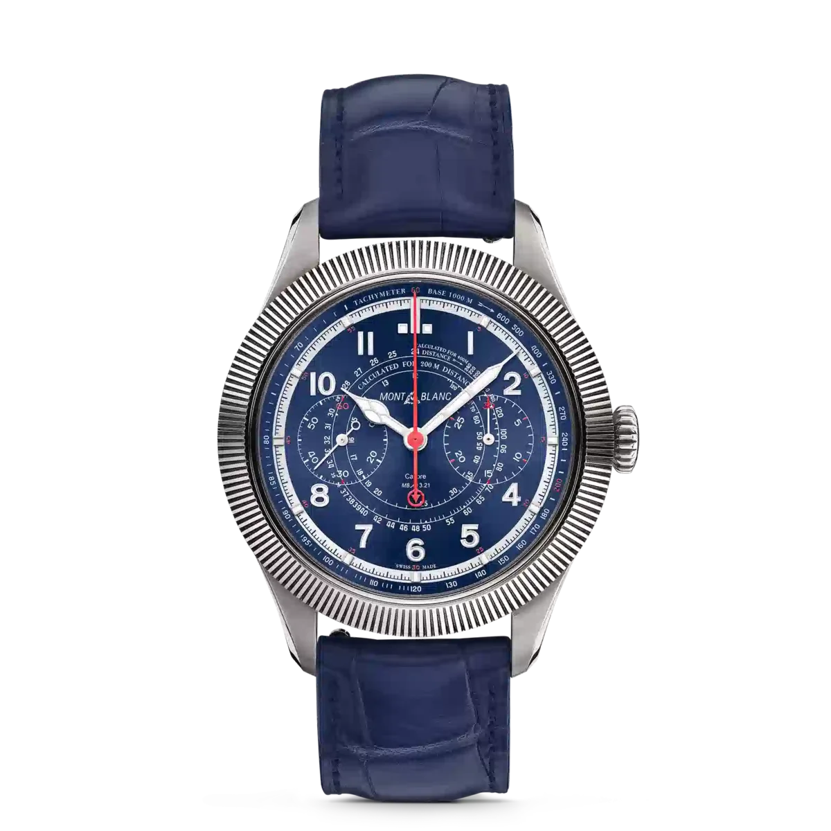 Die Montblanc 1858 Unveiled Timekeeper Minerva Limited Edition verfügt über eine brandneue Chronographenfunktion. Anstelle der traditionellen Drücker wird der Chronograph über die geriffelte Lünette aktiviert. Ein einziger Klick auf die geriffelte Lünette aus 750/1000 Weißgold (18 Karat) startet den Chronographen. Ein zweiter Klick stoppt ihn, ein dritter Klick setzt ihn zurück und verwandelt den Chronographen, wie wir ihn kennen. Die Uhr verfügt über ein 42,5 mm großes Edelstahlgehäuse und ist mit einem blauen Zifferblatt und einem blauen, austauschbaren Alligatorlederarmband ausgestattet. Er wird vom handveredelten Handaufzugskaliber MB M13.21 angetrieben und ist in Anlehnung an das 100-jährige Jubiläum des Kalibers 13.20, dem Vorläufer dieses Uhrwerks, auf 100 Stück limitiert. Ident-Nr. MB130987 Bandanstoßbreite 21 mm